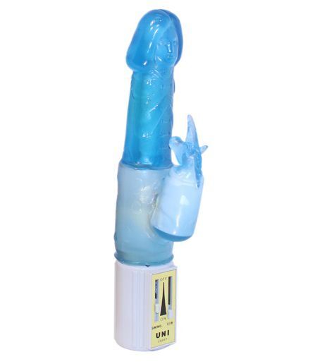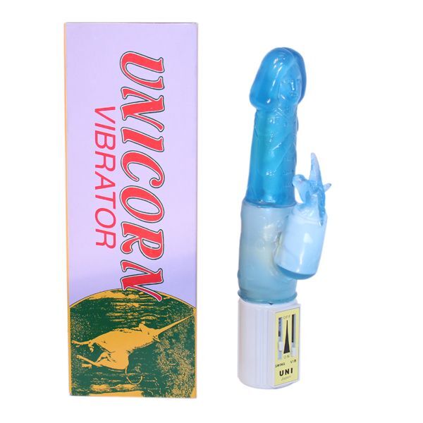 Голубой вибратор с клиторальным отростком в виде единорога UNICORN. Рабочая длина - 10 см.