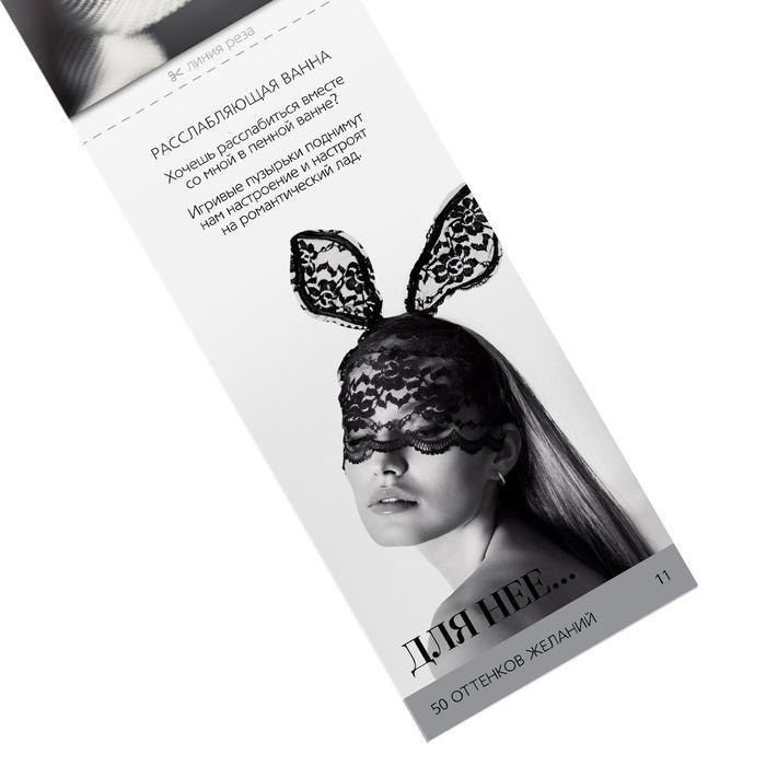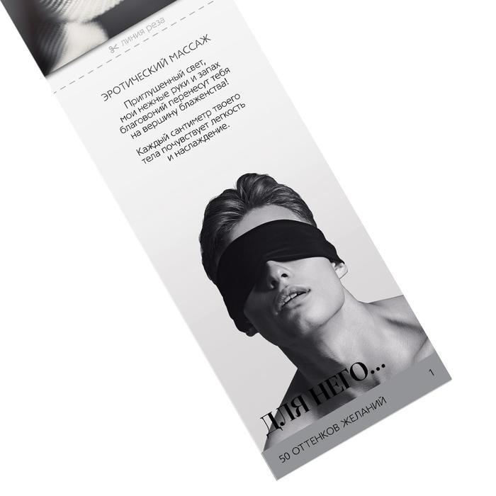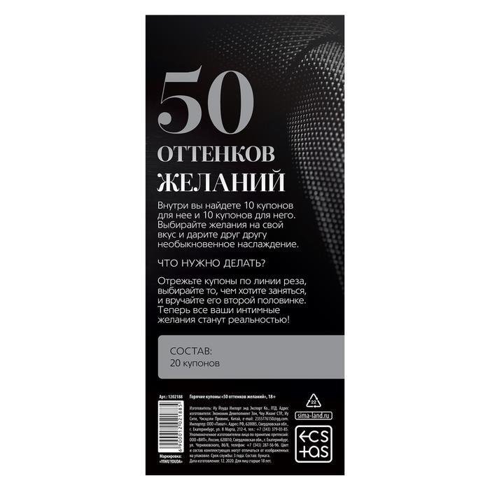 Добавьте страсть в отношения! Порадуйте себя и вторую половинку оригинальным подарком с пикантным содержанием. Горячие купоны «50 оттенков желаний» разнообразят ваши будни! Добавьте в сексуальную жизнь перца. В игре есть купоны для неё и для него. Выбирайте желания на свой вкус и дарите друг другу необыкновенное наслаждение. Что нужно делать? Отрежьте купоны по линии реза, выбирайте то, чем хотите заняться, и вручайте его второй половинке. Теперь все ваши интимные желания станут реальностью! В набор входят 20 купонов.