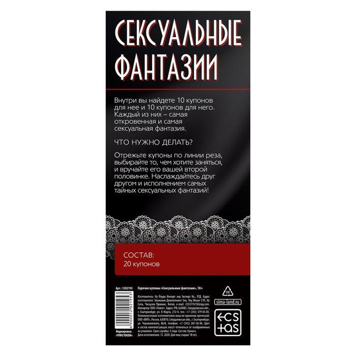Хотите узнать самые пикантные мечты вашей половинки? Горячие купоны «Сексуальные фантазии» не только расскажут о них, но и помогут воплотить в жизнь всё, что вы когда-то задумывали. В наборе вы найдёте 10 купонов для неё и 10 купонов для него. Каждый из них откроет откровенные и смелые сексуальные фантазии. В набор входят 20 купонов.