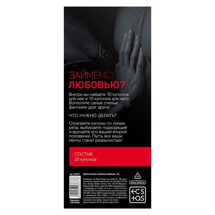 Подарок для самых страстных! Мечтаете удивить своего партнёра, но не знаете, как? Тогда горячие купоны «Займёмся любовью» непременно придутся по вкусу вам и вашей половинке. Исполнение желаний по заказу. Каждый из 20 купонов этого набора — откровенная сексуальная фантазия. Правила просты: отрывайте понравившийся листочек и вручайте его своему партнёру. Теперь все ваши задумки воплотятся в реальность!