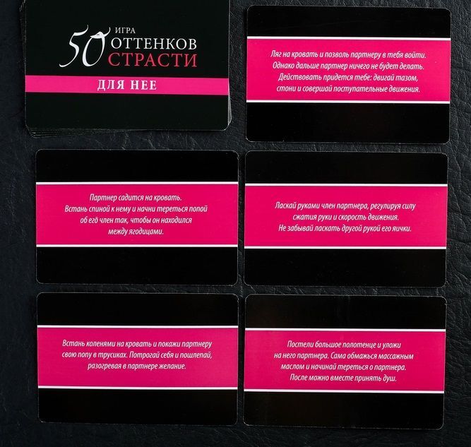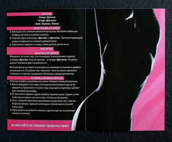 Поднимите отношения на новый уровень! Перед вами чувственная игра, которая вознесёт вас на вершину удовольствия. Поверьте, это не просто слова! В комплекте вас ждут карточки с эротическими фантами для него и для неё, а также целый набор пикантных атрибутов для ролевых игр. Воплотите в жизнь самые смелые фантазии. Приглушите свет, включите романтическую музыку. Уберите подальше мобильные телефоны, чтобы ничего не отвлекало от процесса. Определите, кто начнёт игру. Если это девушка, то она вытягивает карточку из колоды «Для неё». Если это мужчина — из колоды «Для него». Зачитывайте фант и выполняйте его. В процессе используйте все имеющиеся в комплекте атрибуты. Это добавит игре перчинки. Также вы можете применять их отдельно от карточек, придумывая собственные сценарии ролевых игр. В комплекте: 20 карт, кляп, веревка, плетка, правила игры.