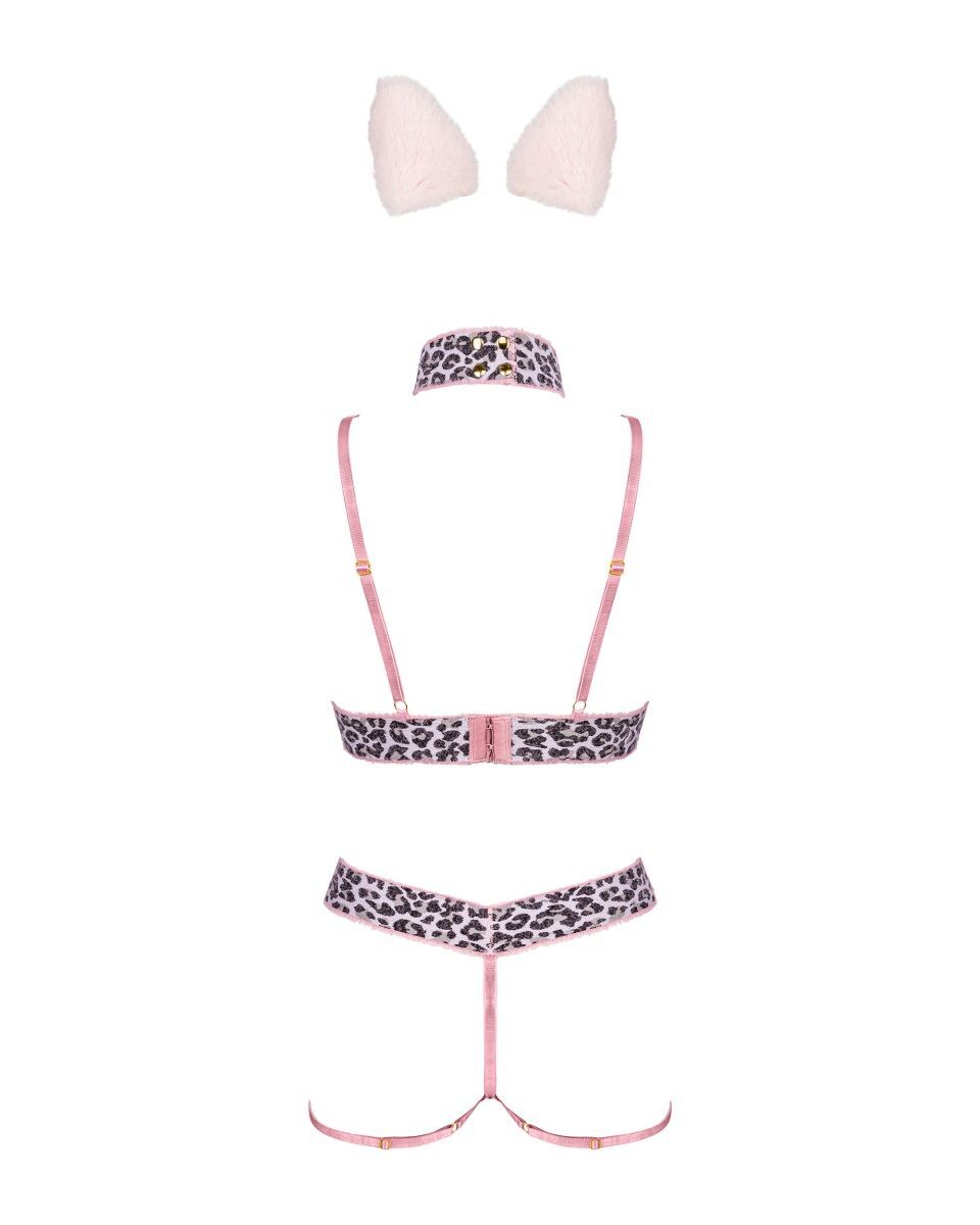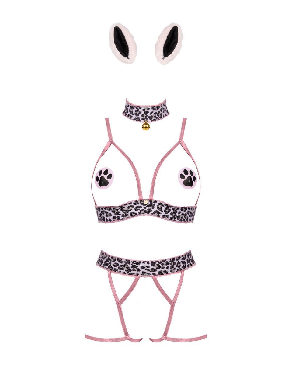 Костюм для ролевых игр Catriny из 5 предметов. Лиф с открытой грудью, пояс с характерным пятнистым рисунком. Тонкие розовые бретельки регулируются по длине, на спине застёжка-удлинитель. Трусики открытые из тонких союзок, пояс с пятнистым рисунком. Ободок с ушками на голову. Чокер с принтом, с застежкой на кнопки, с металлическим бубенцом золотистого цвета и пэстисы на соски. В комплекте: лиф, пояс, ободок, чокер, пэстисы.