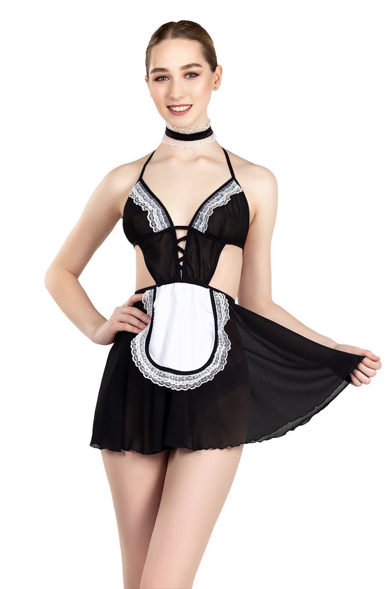 Стать роковой обольстительницей можно с эротическим костюмом горничной от Impirante. Невесомое, прозрачное мини-платье выполнено в черно-белых цветах. Материал очень нежный, тактильно приятный. Ткань грациозно ложится по фигуре и изящно подчеркивает силуэт тела. Кокетливая длина юбочки открывает соблазнительный вид на бедра и ножки. Глубокое кружевное декольте, как магнит, притягивает самые смелые фантазии. Тонкие завязочки на талии, груди и шее, обеспечивают комфортную посадку разному типу фигуры. Эротический наряд легко снимается. В комплекте: платье.