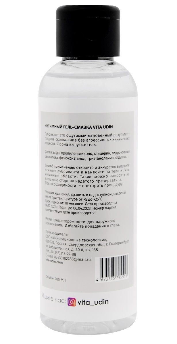 Лубрикант для влюблённых VITA UDIN принесёт яркое наслаждение и максимум удовольствия. Интимный гель-смазка добавит в ваши отношения нотку лёгкости и страсти. Не имеет отталкивающего резкого запаха. Смазка на водной основе, соответственно, не оставляет следов на белье, одежде и смывается обычной водой. Не доставит вам никаких дополнительных неудобств! Имитирует естественную смазку и не изменяет микрофлору влагалища. Обеспечивает комфортное нежное скольжение без липкости. Не вызывает молочницу, аллергию, раздражение, потому что имеет естественный pH. Выступает как заживляющее средство при микротрещинах или пересыхании слизистой. Можно использовать со всеми типами презервативов и секс-игрушек. Окунитесь в мир ярких вкусовых и приятных ощущений вместе с VU! Наслаждайтесь друг другом столько, сколько просит ваша душа.