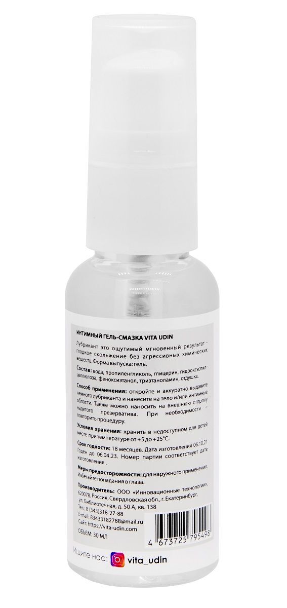 Лубрикант для влюблённых VITA UDIN принесёт яркое наслаждение и максимум удовольствия. Интимный гель-смазка добавит в ваши отношения нотку лёгкости и страсти. Не имеет отталкивающего резкого запаха. Смазка на водной основе, соответственно, не оставляет следов на белье, одежде и смывается обычной водой. Не доставит вам никаких дополнительных неудобств! Имитирует естественную смазку и не изменяет микрофлору влагалища. Обеспечивает комфортное нежное скольжение без липкости. Не вызывает молочницу, аллергию, раздражение, потому что имеет естественный pH. Выступает как заживляющее средство при микротрещинах или пересыхании слизистой. Можно использовать со всеми типами презервативов и секс-игрушек. Окунитесь в мир ярких вкусовых и приятных ощущений вместе с VU! Наслаждайтесь друг другом столько, сколько просит ваша душа.