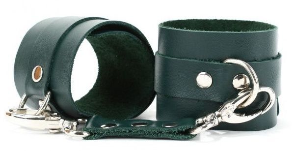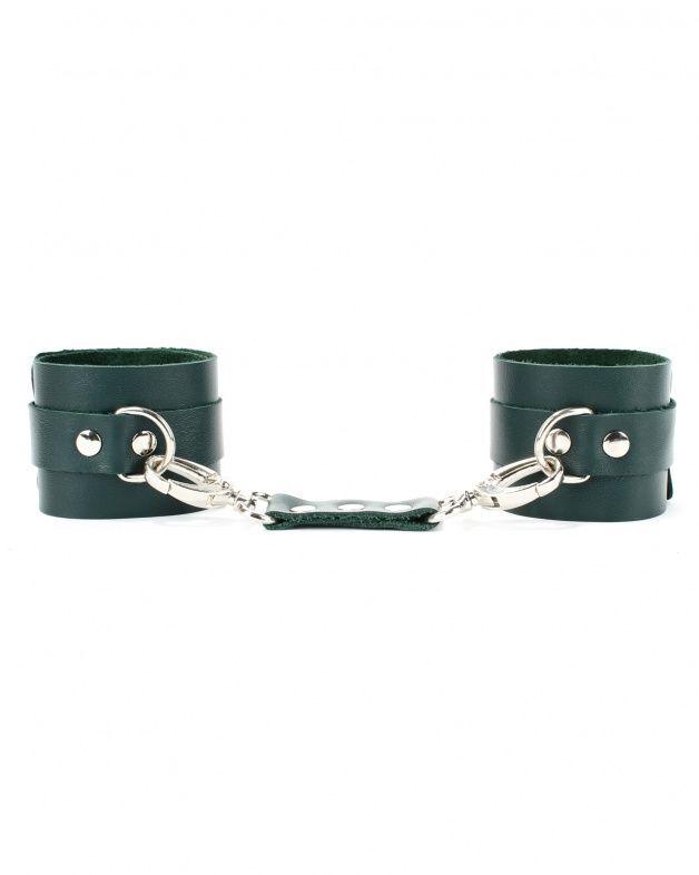 Оковы выполнены из натуральной кожи изумрудного цвета. Металлическая пряжка крепко удерживает в подчинении, кожаное соединение на карабинах фиксирует наручники вместе. Ремни позволяю выбрать нужный размер, подойдут на обхват ноги от 20 до 30 см. Стильный аксессуар поможет воплотить эротические фантазии в реальность. Ширина - 6 см. Длина соединения - 15 см.