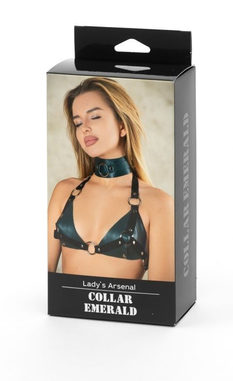 Ошейник сделан из мягкой натуральной кожи изумрудного цвета. Впереди высокая стойка декорирована металлическим кольцом. Размер ошейника регулируется пряжкой сзади, подойдет на обхват от 30 до 40см. Стильный аксессуар разнообразит любую БДСМ игру! Ширина - 5 см. Диаметр кольца - 3,5 см.