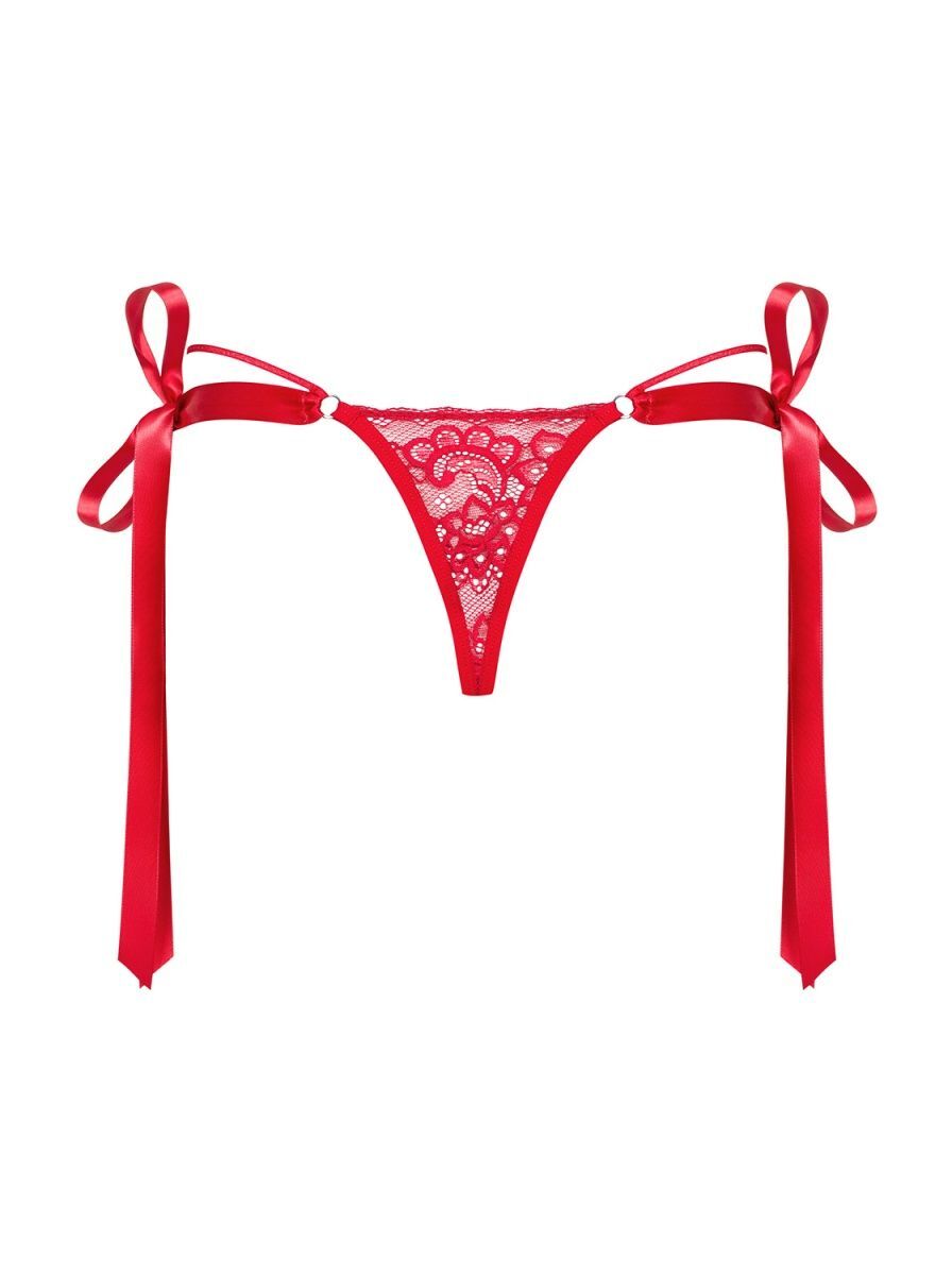 Изящные кружевные трусики-стринг. По бокам украшены эластичными тесемками и широкими атласными лентами.