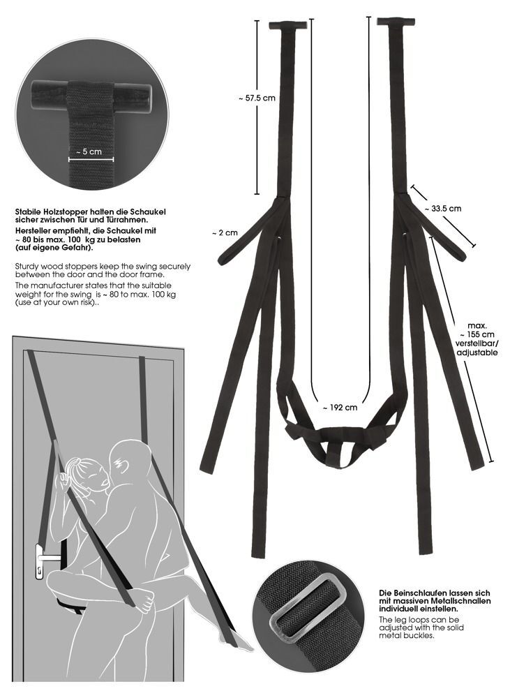 Bad Kitty - качели любви Door Swing. Дверные качели Bad Kitty с ремнем безопасности, ручными ремнями и регулируемыми ремнями для ног. Любовные качели просто вешают над открытой дверью и фиксируют прочными деревянными стопорами, закрывая дверь. Все лямки и петли изготовлены из прочного на разрыв тканого материала. Может быть загружен до 100 кг в соответствии с рекомендациями производителя. Дверной ремень: длина - 57,5 см., ширина - 5 см. Ручной ремешок: длина - 33,5 см., ширина - 2 см. Ремешок для ног: длина - 155 см., ширина - 5 см. Ремень безопасности: длина - 192 см., ширина - 5 см.