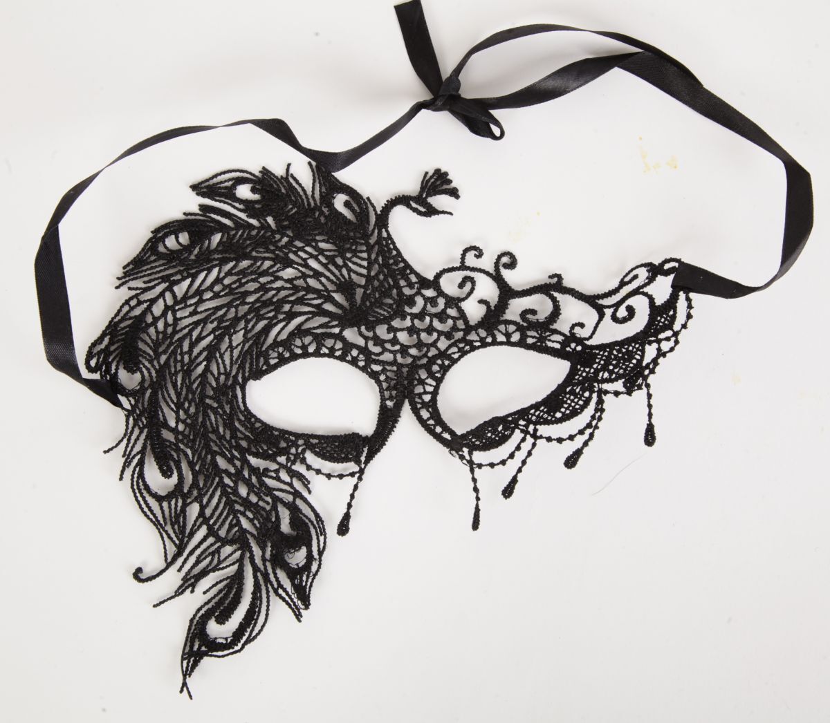 Кружевная маска в венецианском стиле с узором жар-птицы. Завязывается на атласные ленты. Упаковка - бумажный пакет. Размеры - 22 х 18 см.