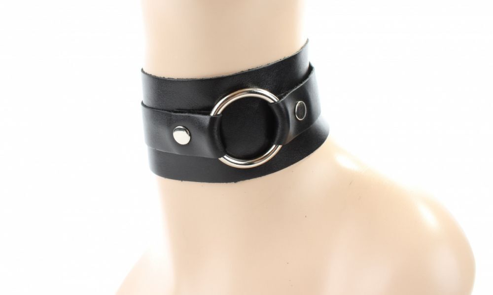 Чокер сделан из мягкой натуральной черной кожи. Впереди высокая стойка декорирована металлическим кольцом, размер чокера регулируется пряжкой сзади. Дизайн аксессуара позволяет носить его двумя сторонами, внося разнообразие в выбранный образ.