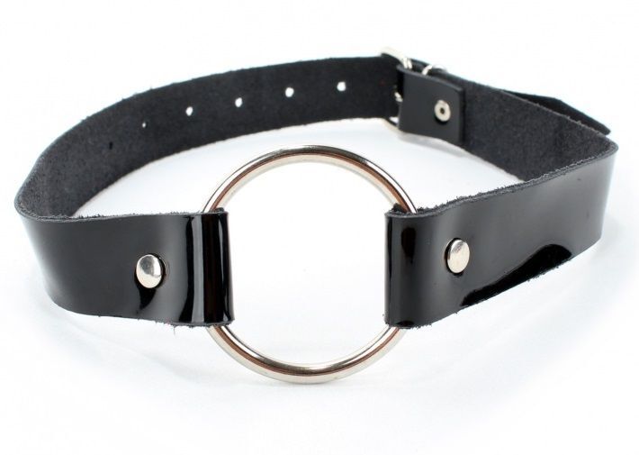 Кляп выполнен из натуральной лакированной кожи черного цвета. Кольцо из прочного металла закреплено ремешками. Размер регулируется пряжкой сзади, подойдет на обхват от 33 до 50 см. Надежный кляп для БДСМ игры. Диаметр кольца - 4,5 см. Ширина ремней - 2 см.