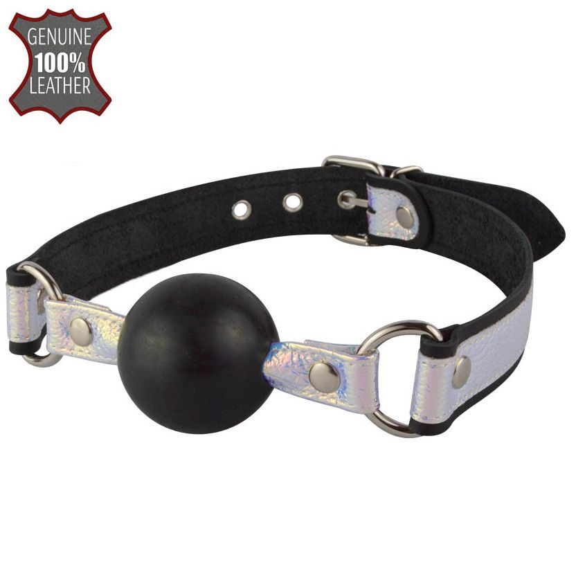 Эффектный девайс от Ситабелла в виде сферического кляпа с яркими ремешками из натуральной высококачественной кожи чёрного цвета, сделает ролевые игры особенно страстными и запоминающимися. Ремешки кляпа декорированы голографическими вставками. Кляп «хамелеон», сделает Ваш образ неповторимым и сексуальным, ведь так красиво Вам ещё не закрывали рот! Легко зафиксировать девайс на шее и отрегулировать размер можно при помощи пряжки. Вся используемая фурнитура имеет хромированное покрытие. Длина ремешков - 57 см., ширина - 2,5 см. Диаметр шара - 4,5 см.