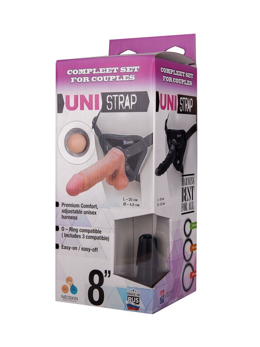 Отличный комплект из трусиков-унисекс, размер которых регулируется длиной ремешков на бедрах, и двух чувственных насадок. Одна из них в точности повторяет формы возбужденного полового члена с мощной головкой, упругим телом и нежной мошонкой, а вторая - будоражит фантазию своими рельефами. Фаллоимитатор телесного цвета изготовлен из неоскина - материала, в точности имитирующего кожу человека и делающего ощущения максимально пикантными и реалистичными. Второй - из ПВХ. Длина телесной насадки - 20 см., рабочая длина - 18 см., диаметр - 4,8 см. Длина чёрной насадки - 18 см., рабочая длина - 17 см., диаметр - 3,5 см. В комплекте 3 кольца диаметром 3, 4 и 5 см.