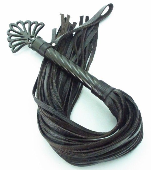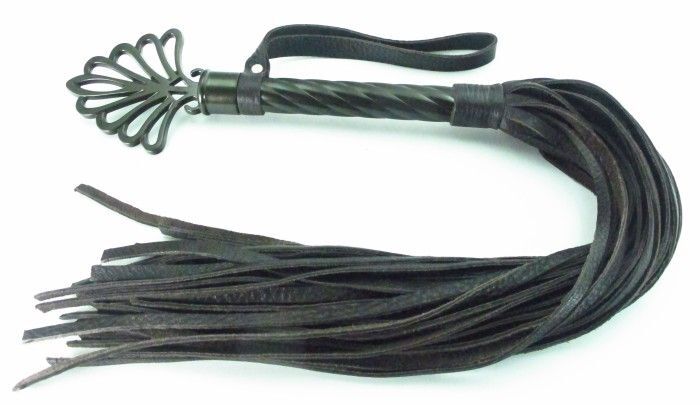 Плеть выполнена из натуральной кожи коричневого цвета. Витая рукоятка сделана из металла цвета шоколад, сверху декор в виде короны Количество хвостов - 40 штук. Для удобства на рукоятке расположена петелька. Стильный аксессуар поможет воплотить эротические фантазии в реальность. Длина рукоятки без декора - 16 см.