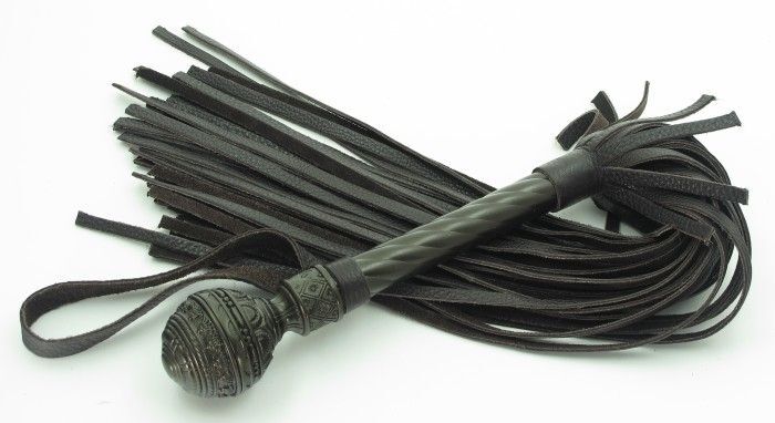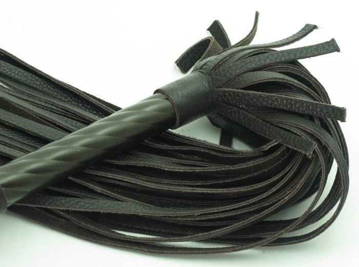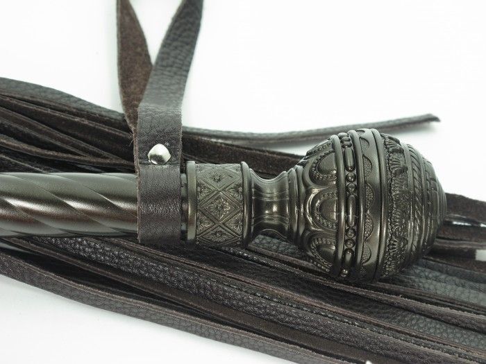Плеть выполнена из натуральной кожи коричневого цвета. Витая рукоятка сделана из металла цвета шоколад, сверху декорирована рельефным шаром. Хвосты длинные и широкие, количество хвостов - 40 штук. Для удобства на рукоятке имеется петелька. Стильный аксессуар поможет воплотить эротические фантазии в реальность. Длина рукоятки - 16 см.