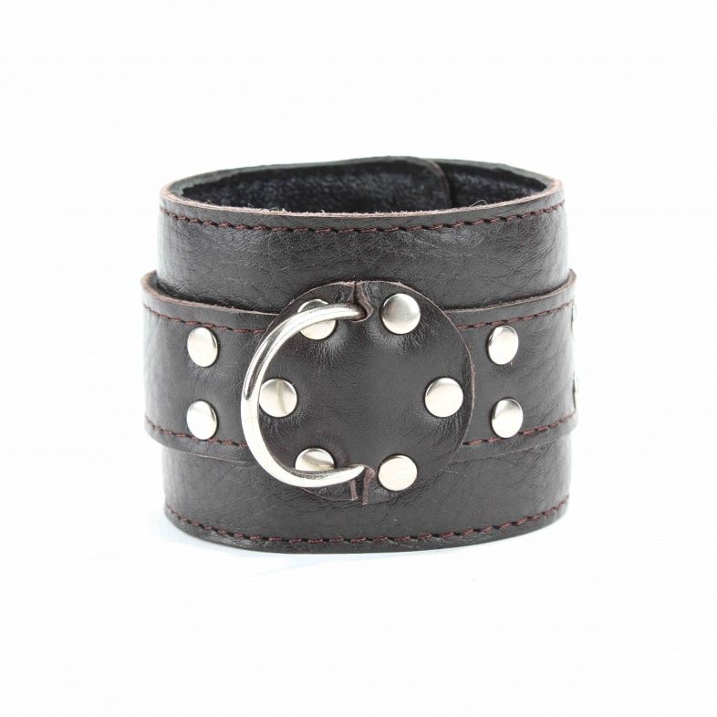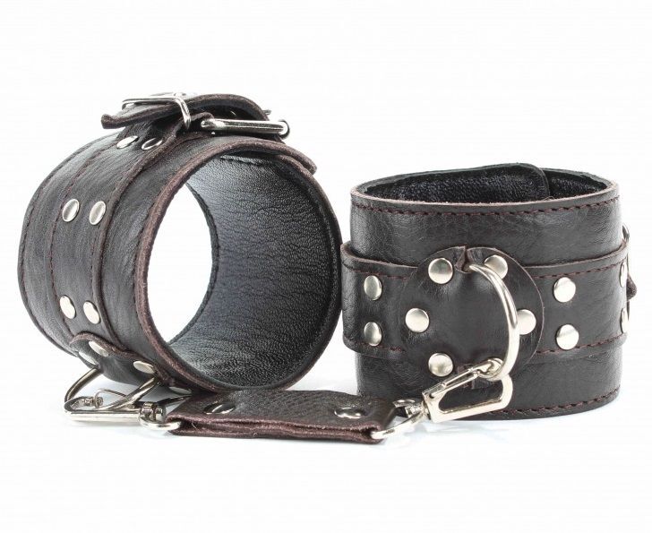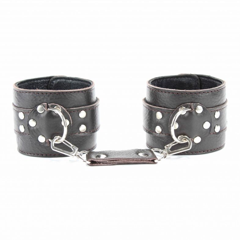 Наручники выполнены из натуральной мягкой кожи темно-коричневого цвета. Изделие декорировано заклепками. По середине расположено полукольцо из сварной фурнитуры. Наручники надежно фиксируются пряжками и ремнями, позволяющими выбрать нужный размер, подойдут на обхват руки от 16 до 24 см. Кожаное соединение на карабинах фиксирует наручники вместе. Приятные для тела и стильные наручники отлично подходят для воплощения эротических БДСМ игр. Ширина - 6 см. Длина соединения - 14 см.