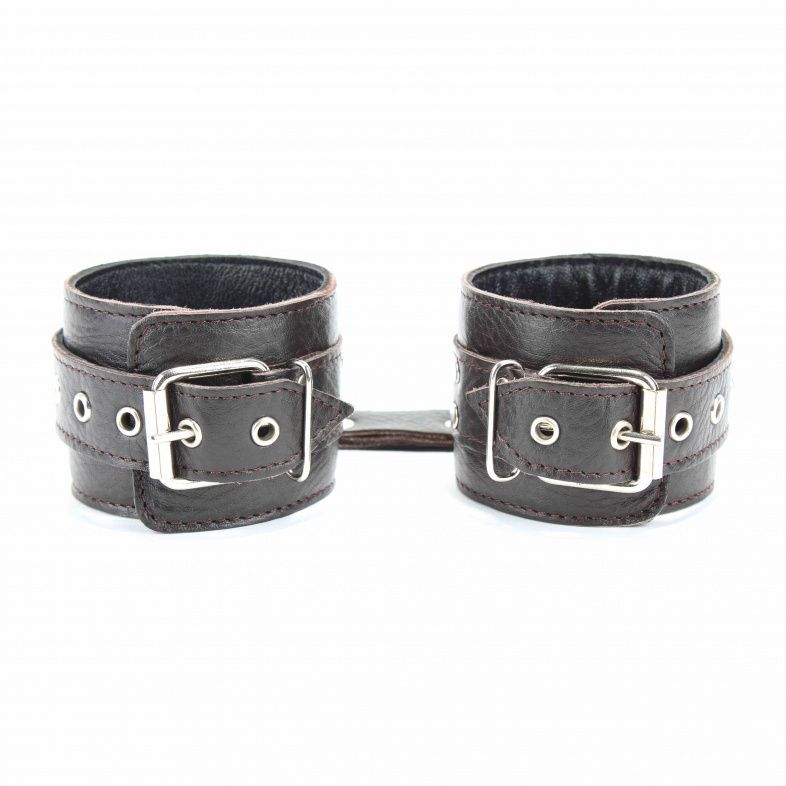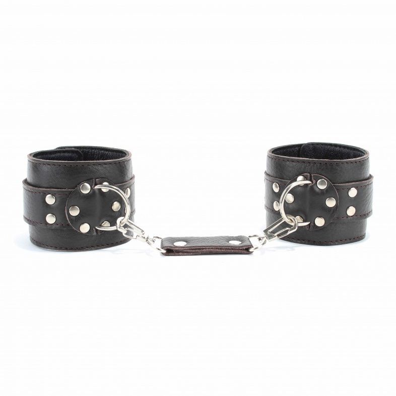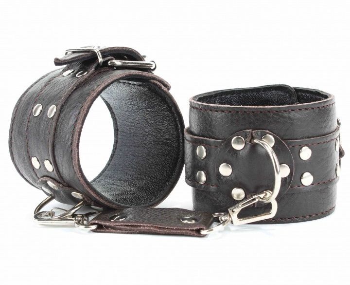 Оковы выполнены из натуральной мягкой кожи темно-коричневого цвета. Изделие декорировано металлическими заклепками. По середине расположено полукольцо из сварной фурнитуры. Оковы надежно фиксируются пряжками и ремнями, позволяющими выбрать нужный размер, подойдут на обхват от 16 до 27 см. Кожаное соединение на карабинах фиксирует оковы вместе. Приятные для тела и стильные наножники отлично подходят для воплощения эротических БДСМ фантазий. Ширина - 6 см. Длина соединения - 14 см.