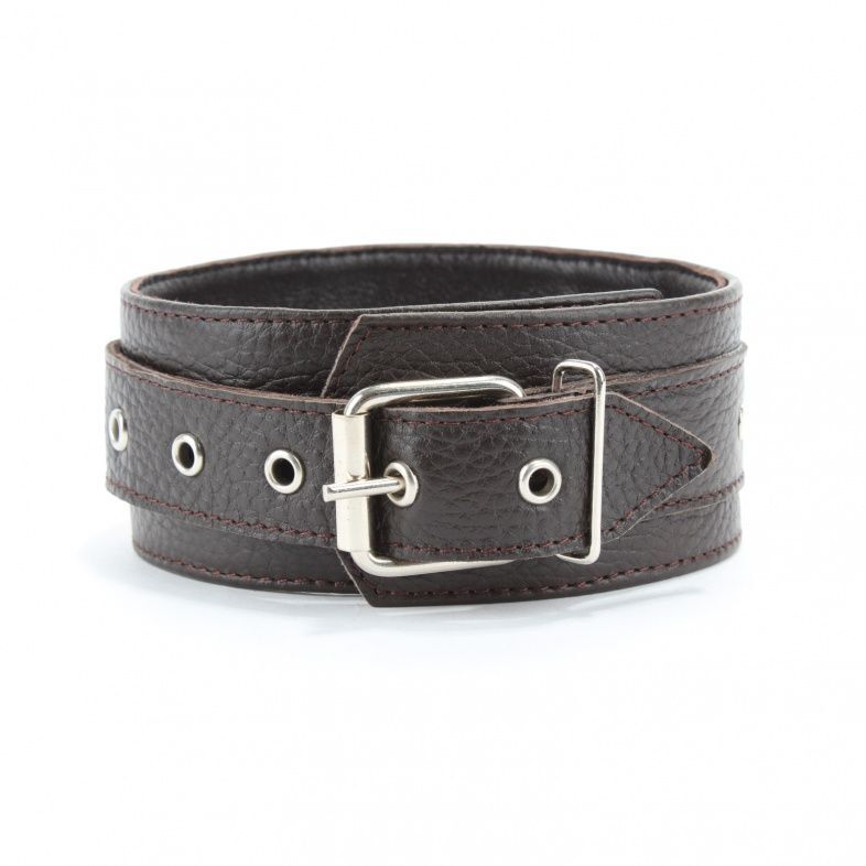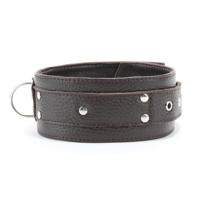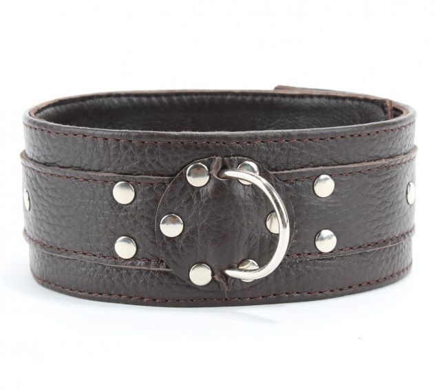 Ошейник выполнен из качественной натуральной коричневой кожи, мягкий и комфортный в использовании. Впереди находится сварное полукольцо. Аксессуар декорирован металлическими заклепками, фиксируется ремнем сзади, удобно регулируется длина, подойдет на обхват от 30 до 38 см. Стильный аксессуар поможет воплотить эротические фантазии в реальность. Ширина - 5 см.