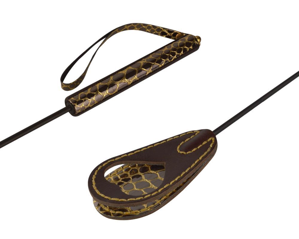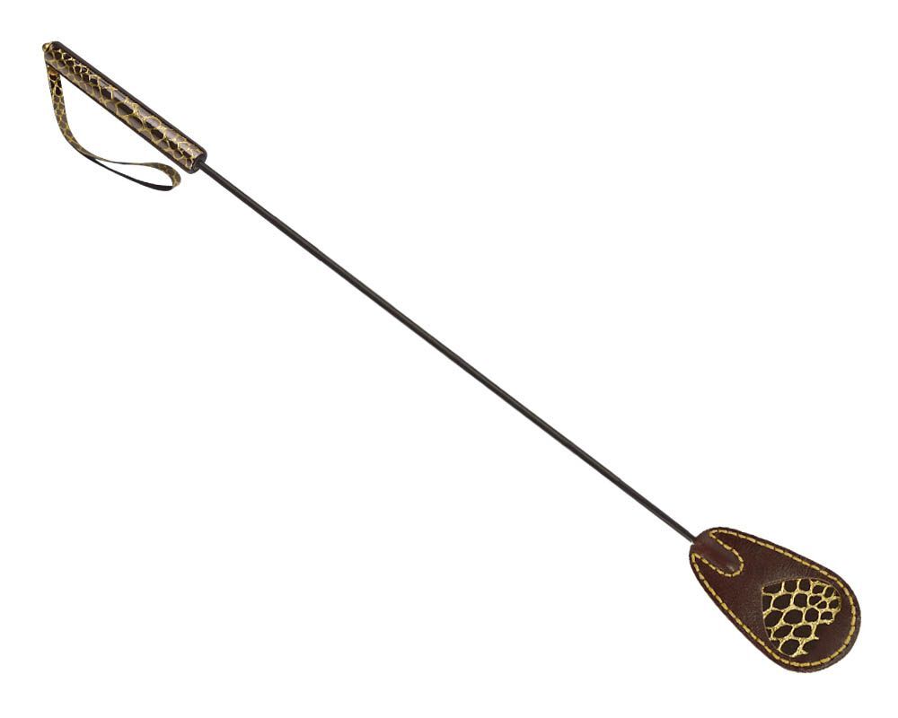 Стек состоит из жесткой рукояти из гибкого полимерного хлыста и каплеобразной хлопушки из натуральной кожи с яркими декоративными вставками Рептилия. Длина рукояти - 15 см. Длина хлопушки - 12 см.