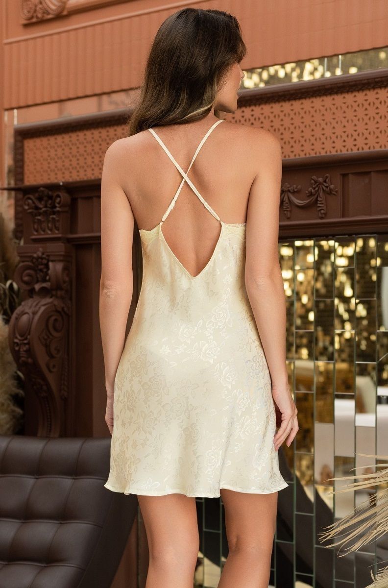 Короткая сорочка полуприлегающего силуэта из искусственного шелка с жаккардовой основой на тонких бретелях. Вырез горловины обработан кружевом. С левой стороны расположен разрез, по краю которого проходит кружево. Бретели на спине перекрещиваются между собой. Маленький атласный бантик украшает вырез сорочки.