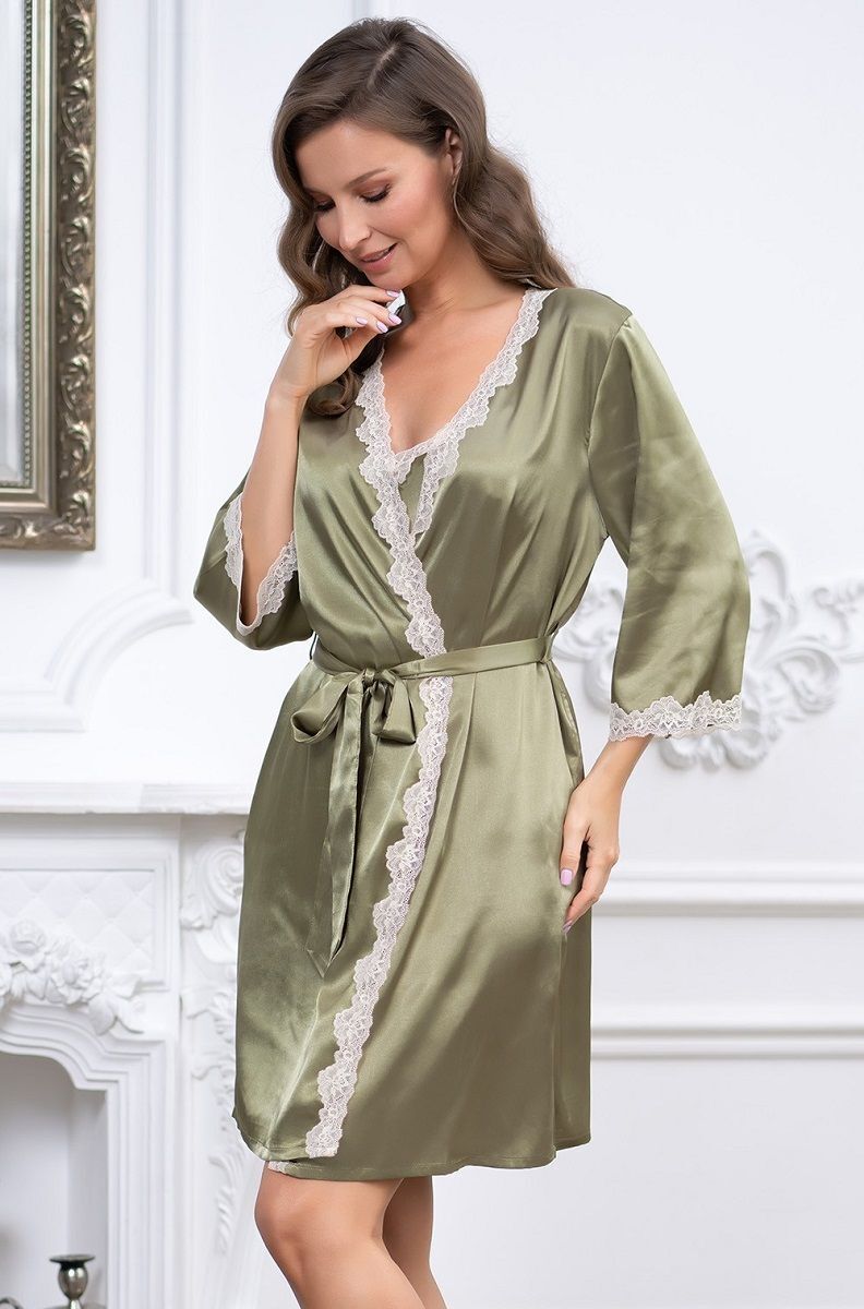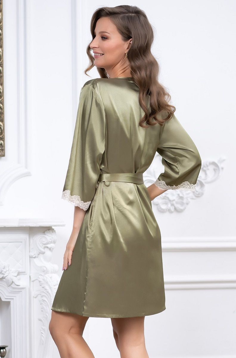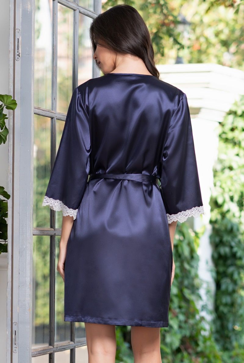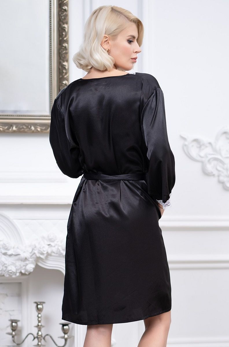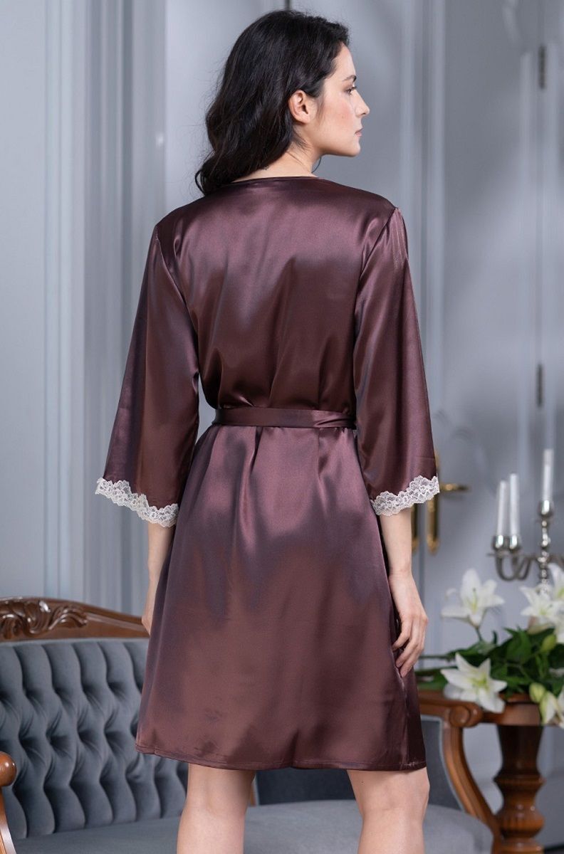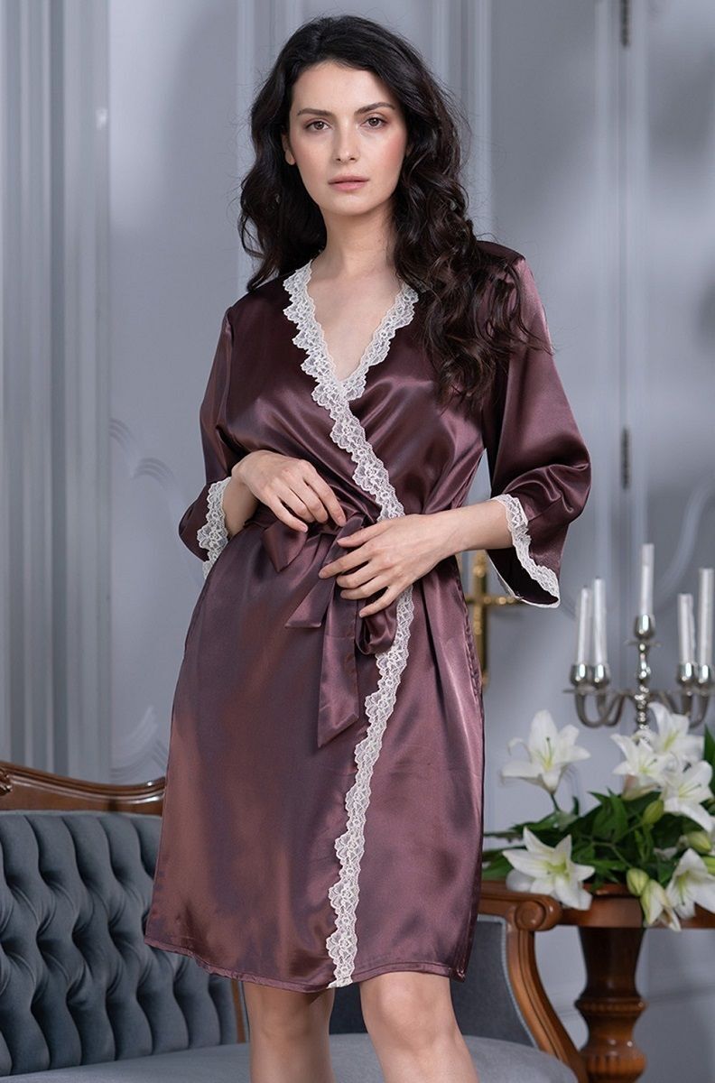 Короткий халат с рукавами 3/4 выполнен из искусственного шелкового полотна с атласным блеском. Рукава и борта халата декорированы изящным кружевом. Халат на запахе с поясом, в боковых швах есть карманы.