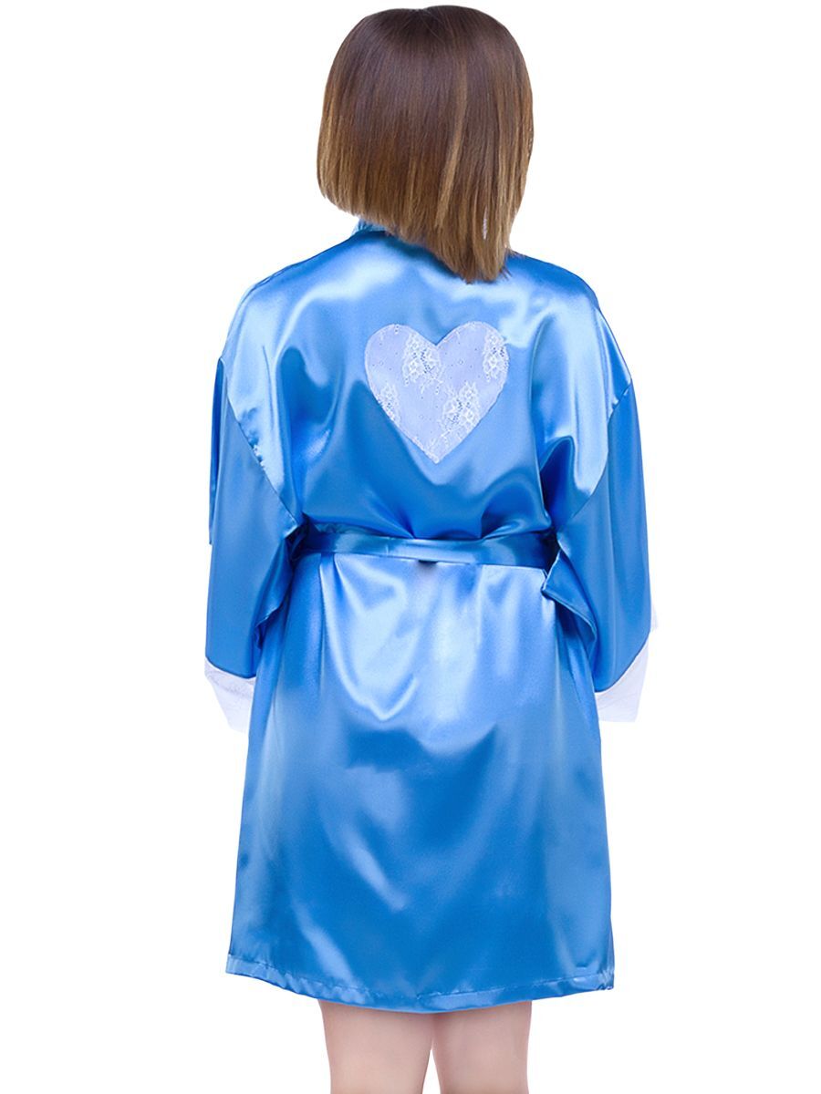 Короткий кокетливый халатик покроя кимоно из однотонного искусственного шелка, с запахом под пояс. Рукава широкие, длиной три четверти, с удлинённой проймой, по низу отделаны изысканным ажурным кружевом с фестонами. На спинке выполнена декоративная вставка в форме сердечка из ажурного кружева. Соответствие размеров: L - 50-52, F - 42-48.