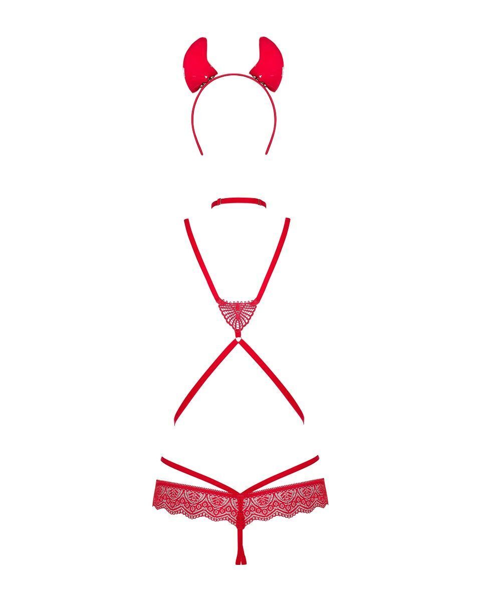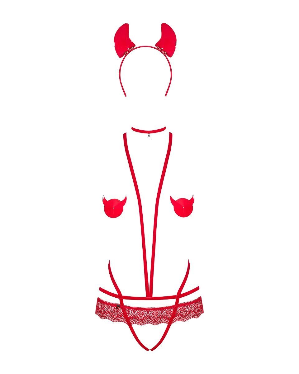 Костюм для ролевых игр. Боди-стринг с открытой ластовицей и грудью выполнен из эластичных союзок, регулируемых по длине. Чокер регулируется по длине. Ободок с рожками универсального размера. Наклейки на соски круглые с рожками. В комплекте: боди, чокер, ободок, пэстисы. Стек не входит в комплект!