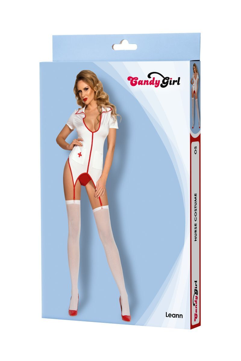 Эластичный костюм медсестры Leann из перламутрового трикотажа с глубоким декольте и пажами декорирован контрастной отделкой. Регулируемые пажи в паре с чулками обеспечат идеальное прилегание и натяжение по фигуре. Короткие рукава, накладные карманы, контрастные Т-стринги с ластовицей и матовые чулки с плотной резинкой завершают образ. В комплекте: корсаж, трусики-стринги, чулки.