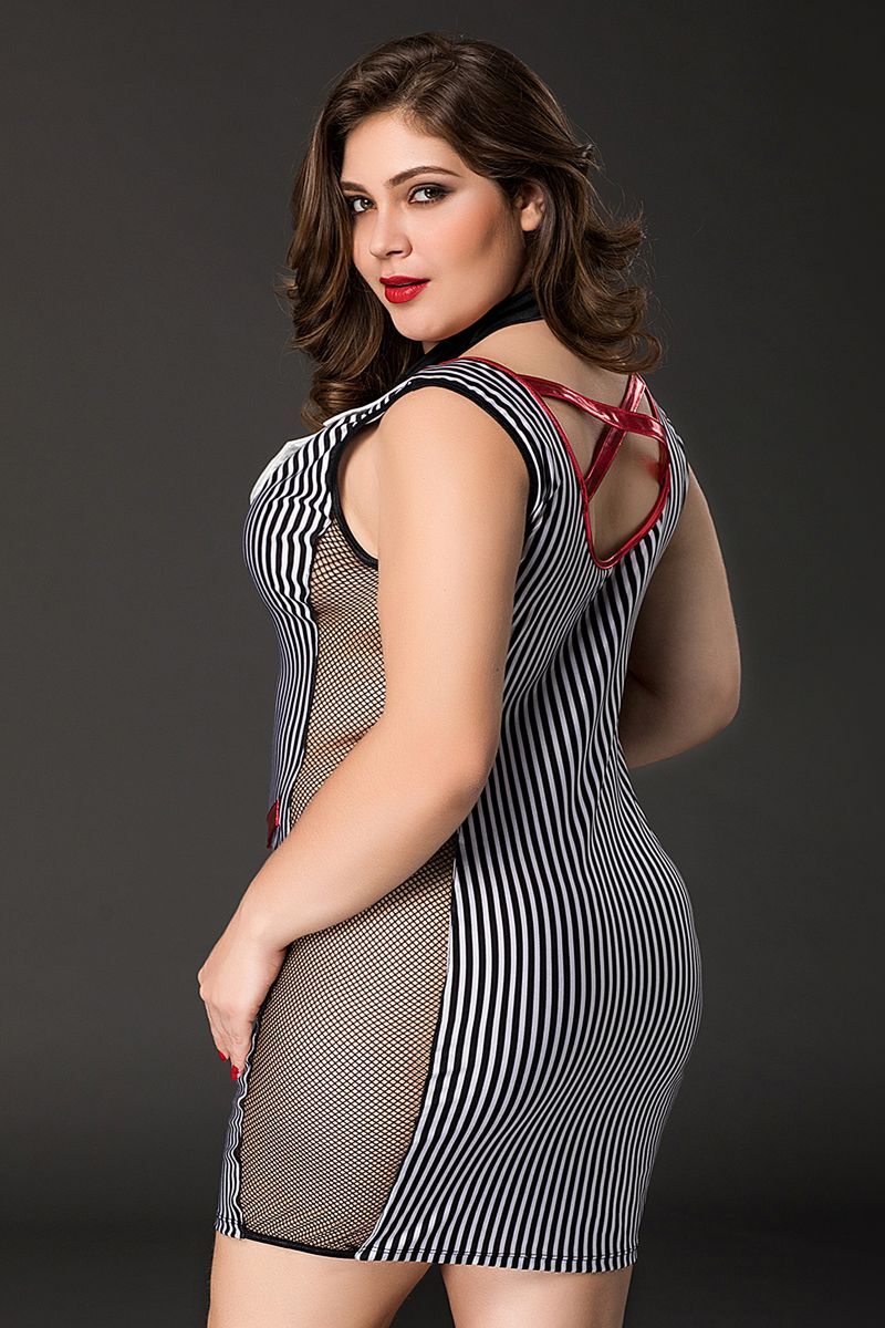 Эластичное платье учительницы с сеточными вставками по бокам Tara от Candy Girl зрительно вытягивает силуэт и представляет фигуру в выгодном свете. Костюм декорирован контрастными деталями: пуговицами, клапанами фальш-карманов, продольной отделкой спереди и перемычками на спине. Отложной сатиновый воротник, трикотажный галстук на кнопке и телескопическая указка дополняют образ. В комплекте: платье, трусики-стринги, галстук, указка.