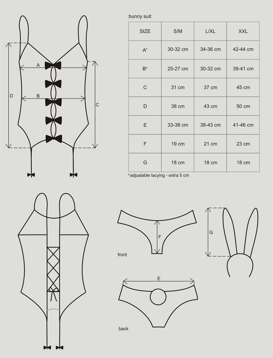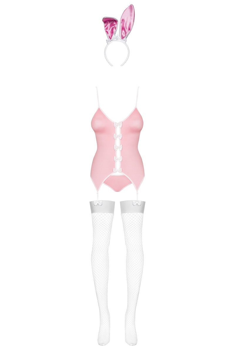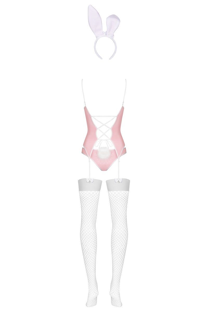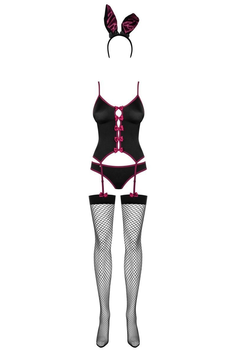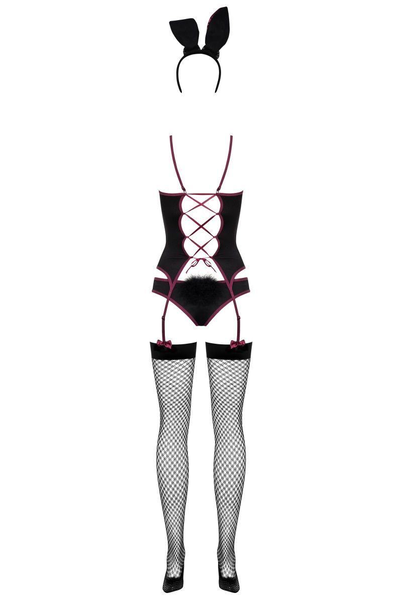 Рядом с такой зайкой в облегающем корсаже и трусиках с хвостиком мужчина почувствует себя охотником. Он обязательно захочет поймать вас в свои объятия, исследовать декольте, украшенное бантом, и распустить шнуровку сзади. Игриво потеребите своё ушко, и за ночь ружьё любви выстрелит не раз… Игривый костюм зайки состоит из корсажа с пажами для чулок, трусиков с маленьким хвостиком, ободка с ушками и чулок. В комплекте: корсаж, трусики, чулки, головной убор.