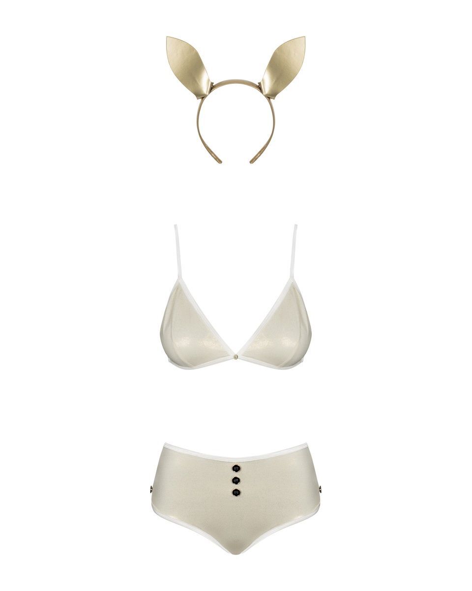 Костюм для ролевых игр Neo Goldes Зайка из ткани с уникальным перламутровым сиянием состоит из 4 предметов. Бюстгальтер с мягкими чашками, бретели регулируются по длине, на спине застежка. Высокие трусики-слипы с декоративными пуговками спереди, сзади пушистый помпон. Бантик-бабочка и ободок с ушками завершают образ. В комплекте: бюстгальтер, трусики, ободок с ушками, чокер.