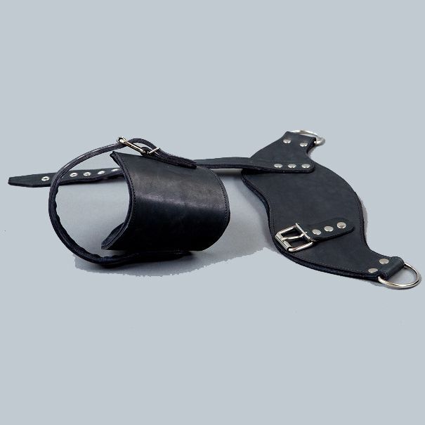 Специальные поножи для подвешивания от фирмы - это Ваш помощник в реализации самых необузданных фантазий в БДСМ-сессиях. Они не нарушают кровообращение, просты в применении и обеспечивают надежную фиксацию. Данная модель изготовлена из жесткой натуральной кожи с металлической фурнитурой. Мягкая подкладка из синтетической пены уменьшает вероятность натирания кожи во время использования. Фиксируются при помощи ремешков. Анатомическая конструкция при правильном использовании исключает вероятность получения травмы. Ширина - 9,5 см. Задний ремень максимальный обхват - 21 см, минимальный - 10 см.