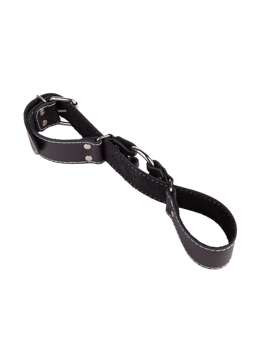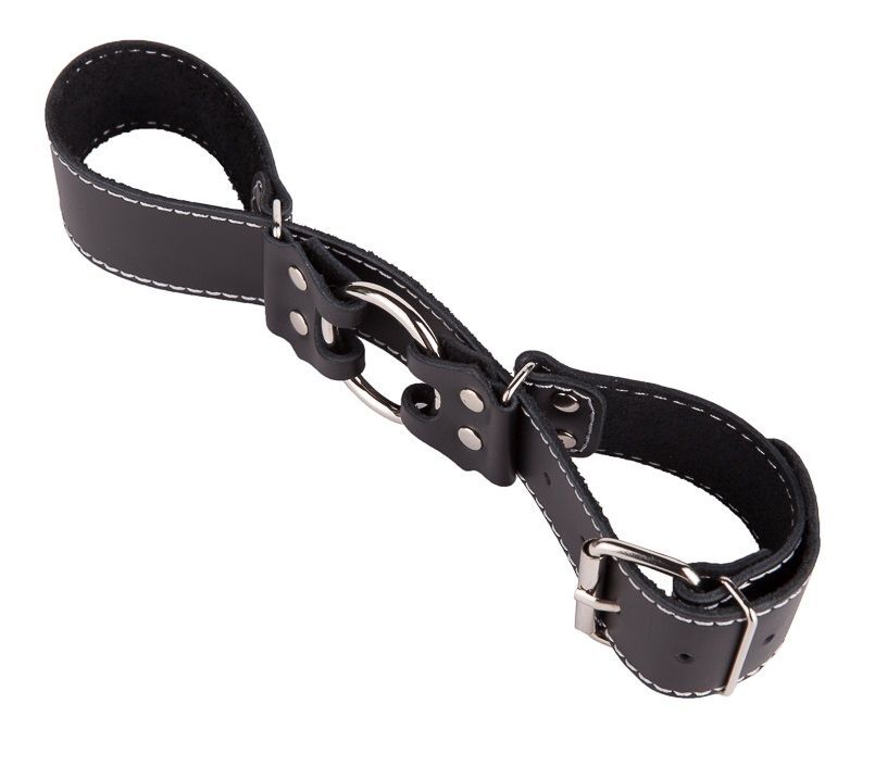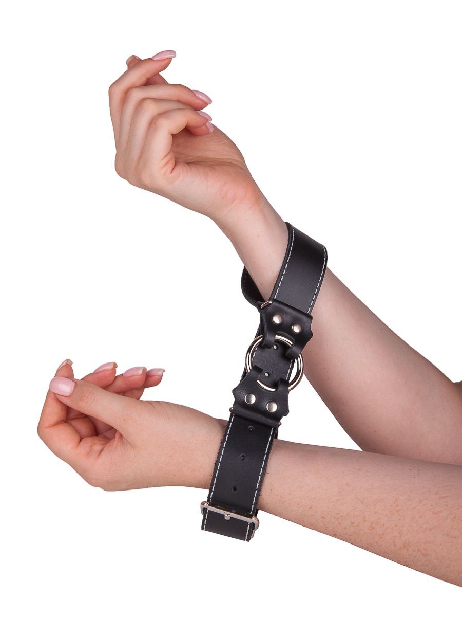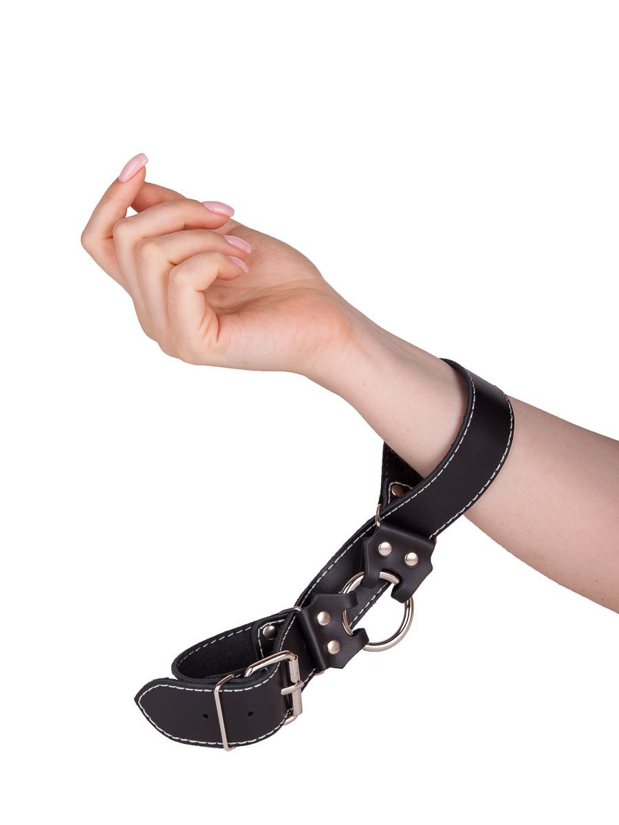 Кожаные ременные наручники ограничат подвижность секс-партнёра фиксацией рук. Оригинальная конструкция наручников имеет вид восьмёрки, которую образуют ремешки из натуральной толстой чёрной кожи. Регулировка размера обеспечивают металлические пряжки. В центре наручников располагается большое кольцо для фиксации к чему-либо. Вся используемая металлическая фурнитура имеет хромированное покрытие.