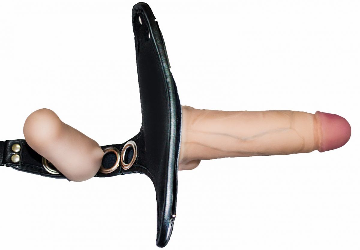 Это вариант - третье, самое «продвинутое» и совершенное поколение поясов для женщин, разработанное с учетом рекомендаций врачей и покупателей. Предполагается использование между женщинами или женщиной и мужчиной. Комплект насадок состоит из трех фаллоимитаторов. Внутренний сделан из атравматичной кибер-кожи на каркасе, передающим стимулирующее воздействие на клитор и вход во влагалище. Четыре отверстия позволяют регулировать эту насадку вне зависимости от комплекции и анатомических особенностей. Внутренний, вагинальный фаллоимитатор можно использовать одновременно с анальной насадкой, которая фиксируется на свободном отверстии. Внешних насадок две. Одна выполнена из мягкого материала неоскин на эластичной полужесткой основе. Атравматичная, нежная поверхность придает особенный комфорт отношениям. Предназначена в основном для вагинального контакта с партнершей. Это распространенный размер, подходящий большинству рожавших женщин. Два отверстия так же позволяют более удобно расположить этот слегка изогнутый фаллоимитатор с характеристиками эрегированного мужского пениса. Модель с изогнутой формой позволяет перевернуть, при необходимости, фаллоимитатор изгибом вверх и изменить область стимуляции. При этом «мошонка» будет ласкать область клитора. Это преимущество данной модели. Для более брутальных отношений или анального секса имеется третья, полужесткая, небольшая насадка черно-серебристого цвета. Сам пояс выполнен в классическом, строгом стиле БДСМ , но для комфортного использования обладает рядом преимуществ. Так, боковые фастексы после точной подгонки и регулировки по фигуре позволяют расстегивать и вновь надевать страпон , не требуя регуляции в дальнейшем. Мягкая бейка по краям и мягкий, вспененный материал между слоями кожи гарантируют атравматичное использование. Бандаж на пояснице плотно и мягко удерживает всю конструкцию при любых нагрузках. Полоса кожи над внутренней вагинальной насадкой, при натяжении регуляторами, плотно прижимает и фиксирует фаллоимитатор в оптимальной позиции, не давая ему чрезмерно выдвигаться вперед. Качественная, синтетическая кожа легко стерилизуется антисептиками и моется бактерицидным мылом. Три коннектора и универсальность стыковочного узла позволяют использовать абсолютное большинство насадок, входящих в ассортимент магазинов и продающихся отдельно. Длина внешней фаллической насадки - 18,5 см., рабочая длина - 16 см., диаметр - 4,5 см. Длина внешней анальной насадки - 14,5 см., диаметр - 3,2 см.
