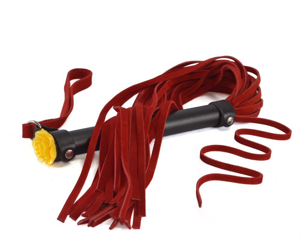 Красная многохвостая плеть с розой на рукояти - 57 см.