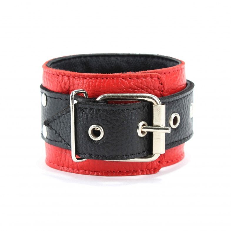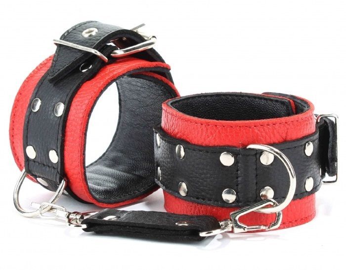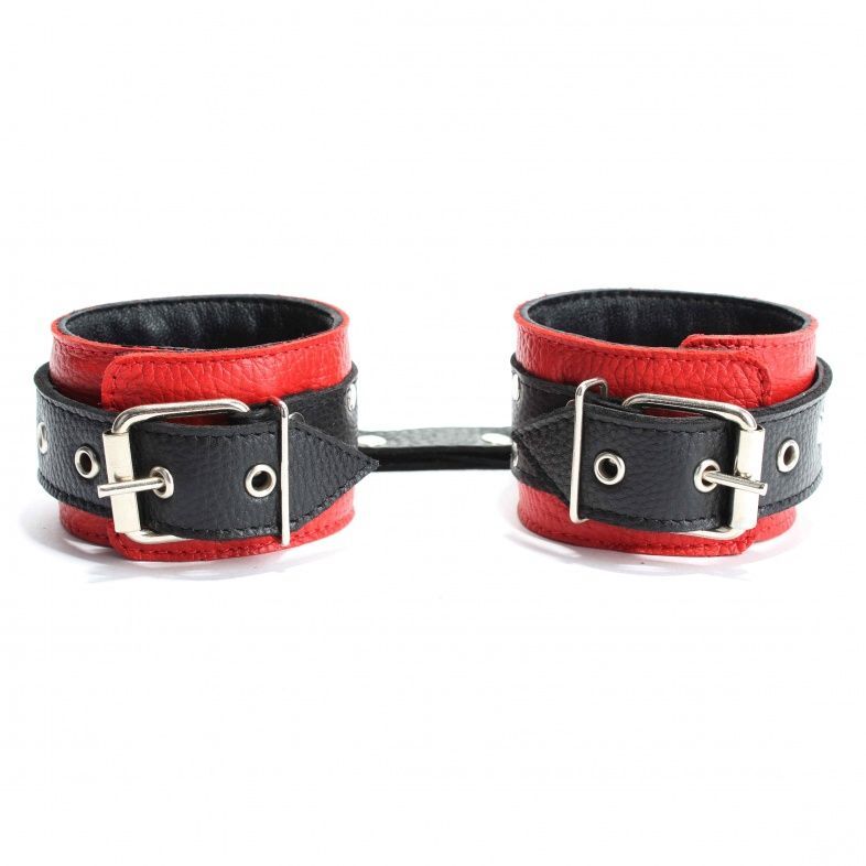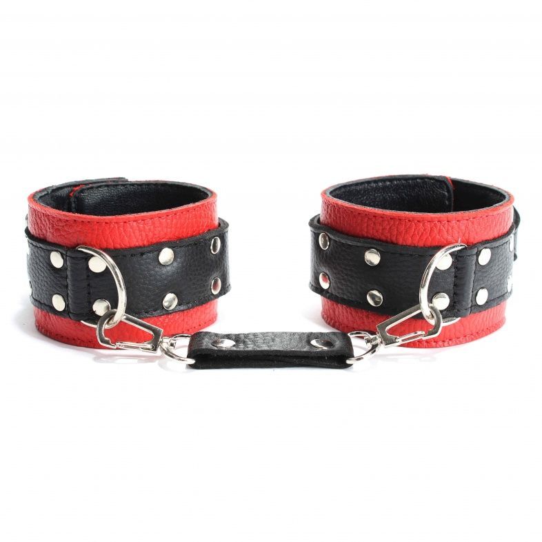 Наручники выполнены из красной натуральной кожи, с ремнями из черной кожи. Изделие декорировано заклепками. Посередине расположено полукольцо из сварной фурнитуры. Наручники надежно фиксируются пряжками и ремнями, позволяющими выбрать нужный размер, подойдут на обхват руки от 15 до 20 см. Кожаное соединение на карабинах фиксирует наручники вместе. Стильные наручники отлично подходят для воплощения эротических БДСМ игр. Ширина - 5 см. Длина соединения - 15 см.