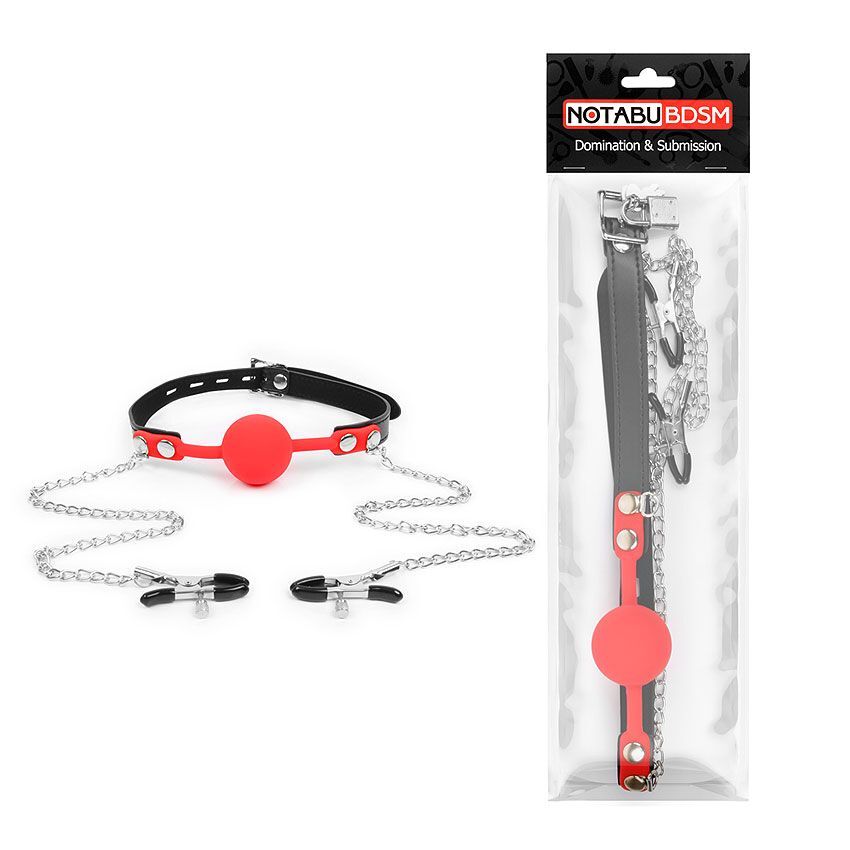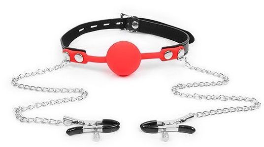Красный кляп-шарик с зажимами на соски на металлической цепочке