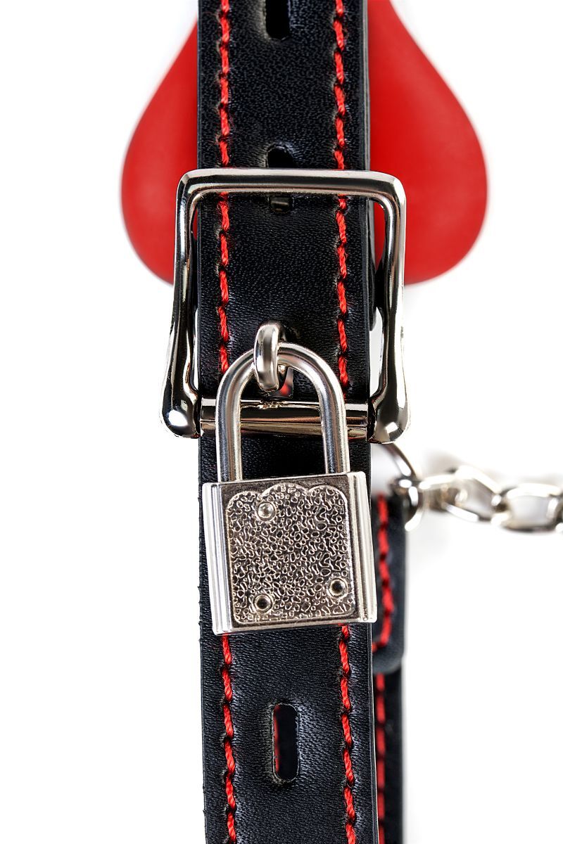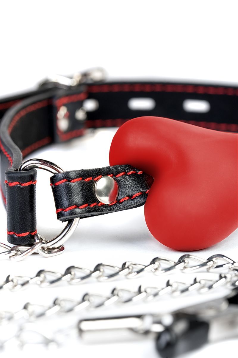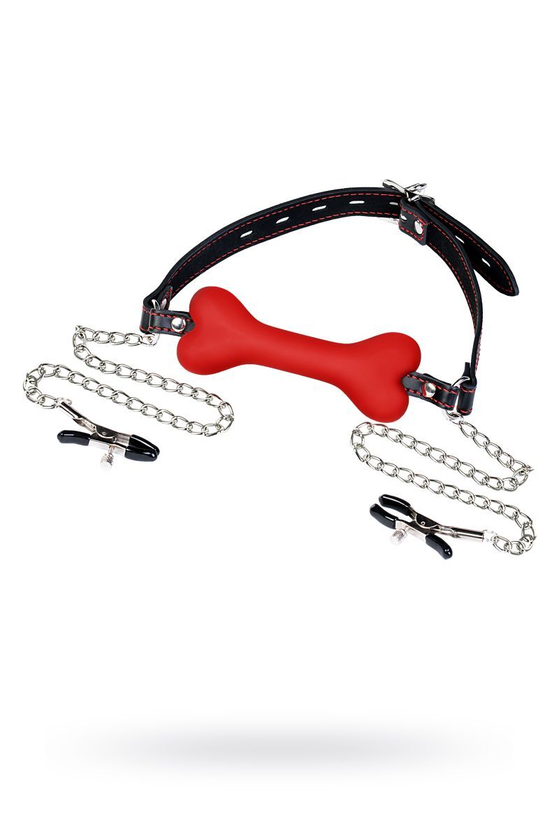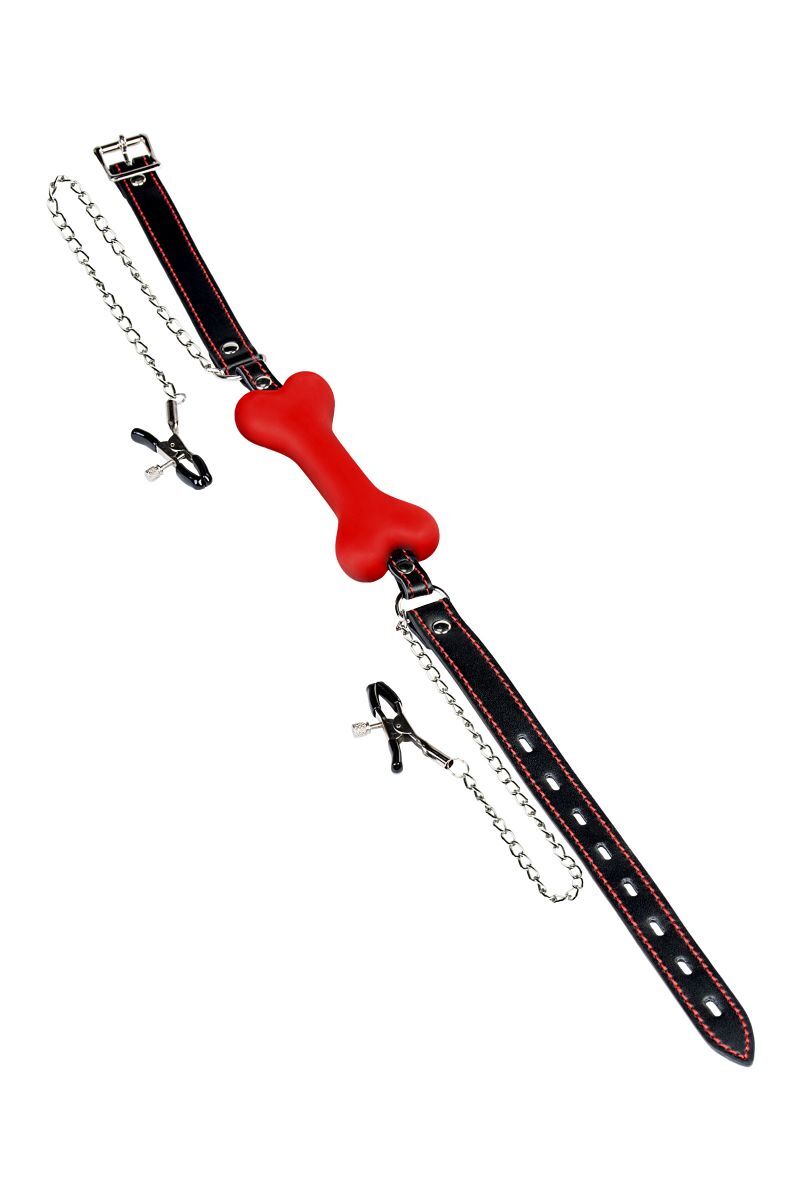 Красный кляп-трензель Theatre в виде косточки с зажимами для сосков