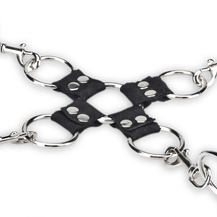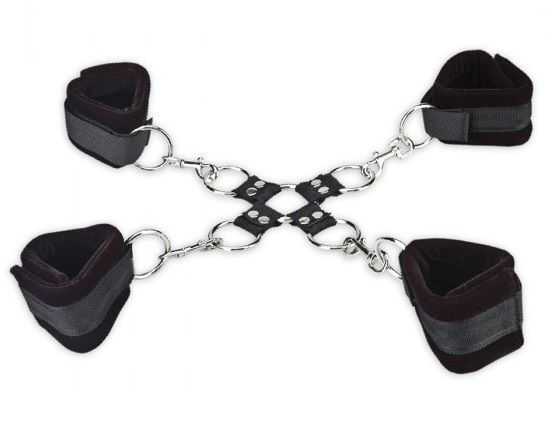 Комплект для сковывания из 4 мягких браслетов на липучках с металлическими карабинами и соединительной части с кольцами. Все браслеты можно использовать отдельно - как наручники или оковы для лодыжек, либо попарно соединять конечности. А соединительное звено поможет надежно и комфортно зафиксировать руки и ноги партнера одновременно.