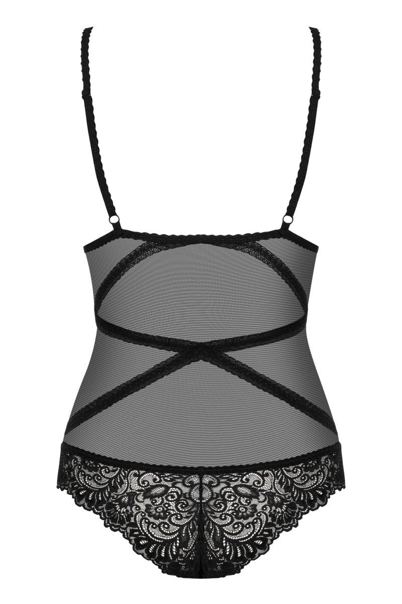 Женственное боди изготовлено из тонкого тюля. Мягкие чашечки и низ модели выполнены из кружева с цветочным узором. Аккуратные бантики украшают боди под грудью и снизу. Декоративная тесьма словно окутывает изделие спереди и сзади. Бретели регулируются по длине.