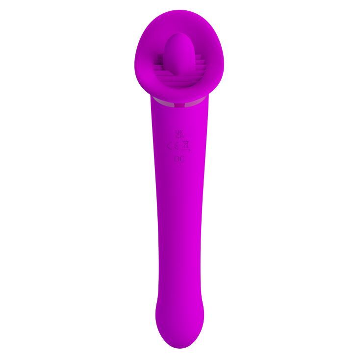 Лиловый двусторонний вибратор Faust с подвижным язычком. Оригинальная игрушка, подходящая как для ласк лона, так и для массажа клитора. Гладкий, чуть изогнутый ствол с вибрацией обеспечит чувственное воздействие на стенки лона и току G. Широкая часть с мягким язычком идеальна для массажа клитора. 12 режимов вибрации, 12 скоростей движения язычка. Длина вагинальной части - 16 см., диаметр - 3,2 см.