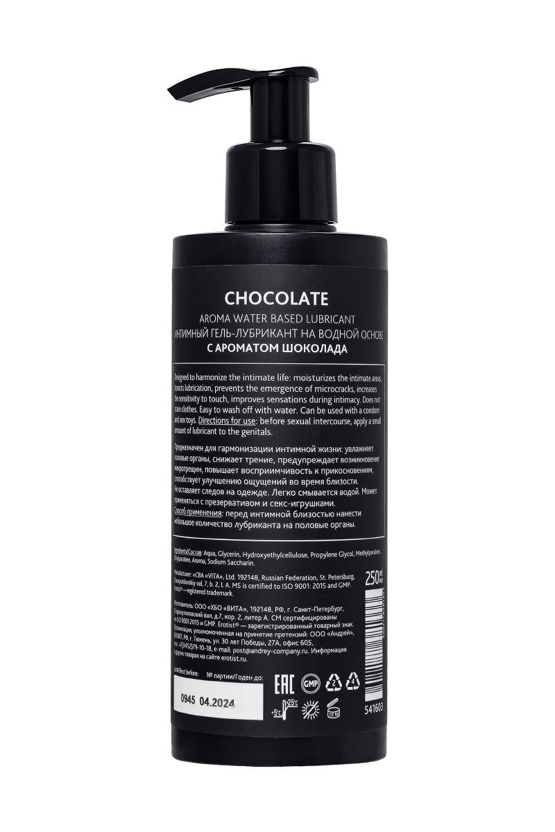 Как доставить удовольствие женщине в 10 часов вечера? Побаловать её шоколадом! Как доставить двойное удовольствие женщине в 10 часов вечера? Побаловать её ароматизированным лубрикантом Erotist Chocolate. Самая популярная смазка в линейке Erotist позволит наслаждаться близостью в любое время и в любом месте! Пьянящий аромат шоколада, сладкие фантазии и скольжение всю ночь напролет — это стоит познать… Лубрикант Erotist Chocolate имеет водную основу: он гипоаллергенен, совместим с презервативами и игрушками для взрослых, не оставляет следов и легко смывается водой.