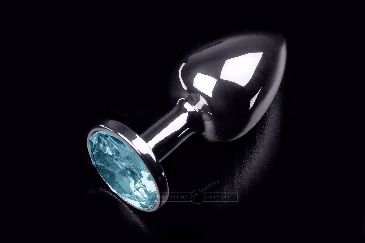 Маленькая серебристая анальная пробка с круглым кончиком и голубым кристаллом - 7 см.