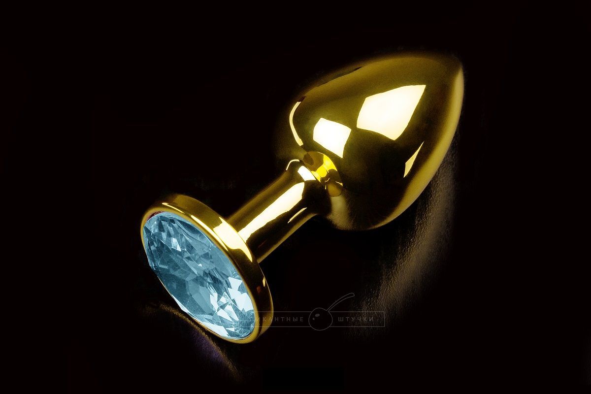 Маленькая золотистая анальная пробка с круглым кончиком и голубым кристаллом - 7 см.