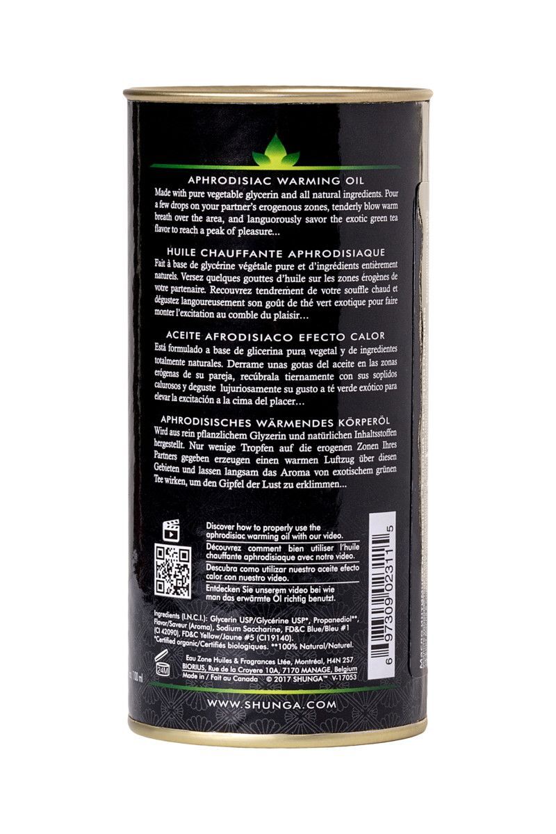 Разогревающее и съедобное масло для тела с натуральными ароматом зелёного чая. Усильте удовольствие и ощущения эрогенных зон вашего партнера. Согревающий эффект масла в сочетании с превосходным ароматом экзотического зеленого чая доставят максимум удовольствий. •Изготовлено из чистого растительного глицерина и экстракта семян кукурузы, являющихся сертифицированными органическими продуктами •Превосходный аромат экзотического зеленого чая •Идеально подходит для использования на эрогенных зонах •Согревающий эффект возникает благодаря теплому дыханию •Восхитительный вкус •Усиливает ощущения •Не содержит сахара Используйте во время предварительных ласк, чтобы усилить ощущения и продлить наслаждение. Нанесите небольшое количество масла на все тело и особенно на эрогенные зоны. Начинает действовать от горячего дыхания нежных интимных поцелуев.