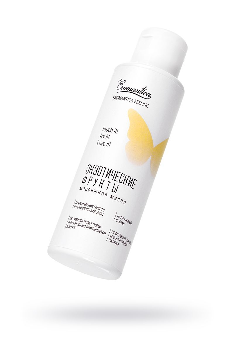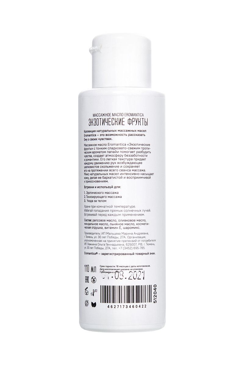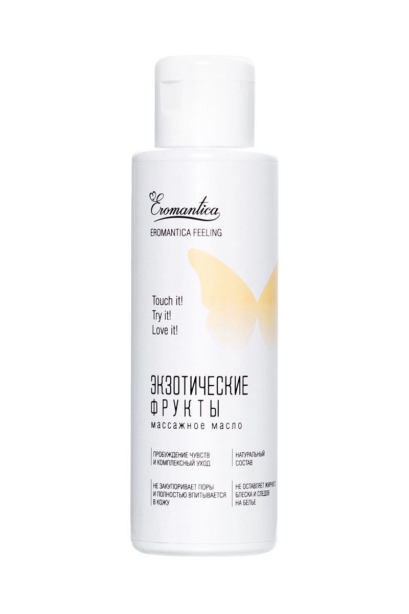 Коллекция натуральных массажных масел Eromantica — это возможность рассказать Ему о своих чувствах. Массажное масло Eromantica «Экзотические фрукты» с тонким сладковато-свежим тропическим ароматом папайи помогает разбудить чувства и создает атмосферу беззаботности и романтики. Его легкая текстура придает каждому движению рук возбуждающее шелковистое скольжение и сохраняет его на протяжении всего сеанса массажа. Микс натуральных масел оливы, миндаля и семян льна интенсивно насыщает кожу жирными кислотами, витаминами и микроэлементами, делая ее бархатистой и восприимчивой к прикосновениям. Встряхни и используй для: Эротического массажа: согрей масло в ладонях и распредели его по телу партнера плавными массажными движениями. Особое внимание уделяй эрогенным зонам. Тонизирующего массажа: нанеси масло на нужный участок тела и разогрей кожу интенсивными движениями. Затем проработай мышцы, сжимая их пальцами рук. Ухода за телом: нанеси сразу после душа на влажную кожу и равномерно распредели по телу.