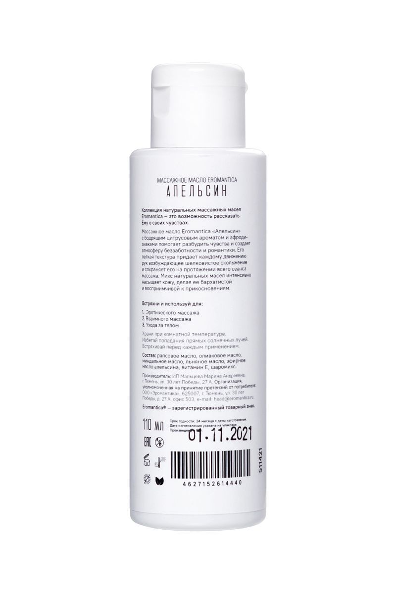 Коллекция натуральных массажных масел Eromantica — это возможность рассказать Ему о своих чувствах. Массажное масло Eromantica «Апельсин» с бодрящим цитрусовым ароматом помогает разбудить чувства и создает атмосферу беззаботности и романтики. Его легкая текстура придает каждому движению рук возбуждающее шелковистое скольжение и сохраняет его на протяжении всего сеанса массажа. Микс натуральных масел оливы, миндаля и семян льна интенсивно насыщает кожу жирными кислотами, витаминами и микроэлементами, делая ее бархатистой и восприимчивой к прикосновениям. Встряхни и используй для: - Эротического массажа: согрей масло в ладонях и распредели его по телу партнера плавными массажными движениями. Особое внимание уделяй эрогенным зонам. - Тонизирующего массажа: нанеси масло на нужный участок тела и разогрей кожу интенсивными движениями. Затем проработай мышцы, сжимая их пальцами рук. - Ухода за телом: нанеси сразу после душа на влажную кожу и равномерно распредели по телу. Храни при комнатной температуре. Избегай попадания прямых солнечных лучей. Встряхивай перед каждым применением.
