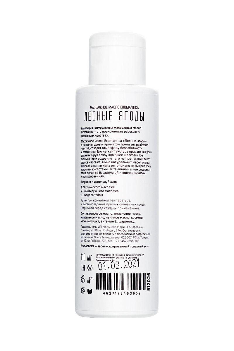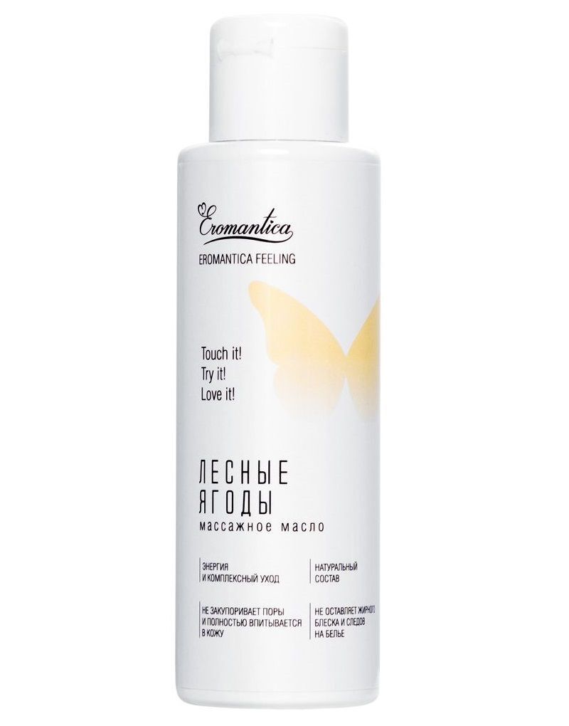 Коллекция натуральных массажных масел Eromantica — это возможность рассказать Ему о своих чувствах. Массажное масло Eromantica «Лесные ягоды» с тонким ягодным ароматом помогает разбудить чувства и создает атмосферу беззаботности и романтики. Его легкая текстура придает каждому движению рук возбуждающее шелковистое скольжение и сохраняет его на протяжении всего сеанса массажа. Микс натуральных масел оливы, миндаля и семян льна интенсивно насыщает кожу жирными кислотами, витаминами и микроэлементами, делая ее бархатистой и восприимчивой к прикосновениям. Встряхни и используй для: - Эротического массажа: согрей масло в ладонях и распредели его по телу партнера плавными массажными движениями. Особое внимание уделяй эрогенным зонам. - Тонизирующего массажа: нанеси масло на нужный участок тела и разогрей кожу интенсивными движениями. Затем проработай мышцы, сжимая их пальцами рук. - Ухода за телом: нанеси сразу после душа на влажную кожу и равномерно распредели по телу. Храни при комнатной температуре. Избегай попадания прямых солнечных лучей. Встряхивай перед каждым применением.