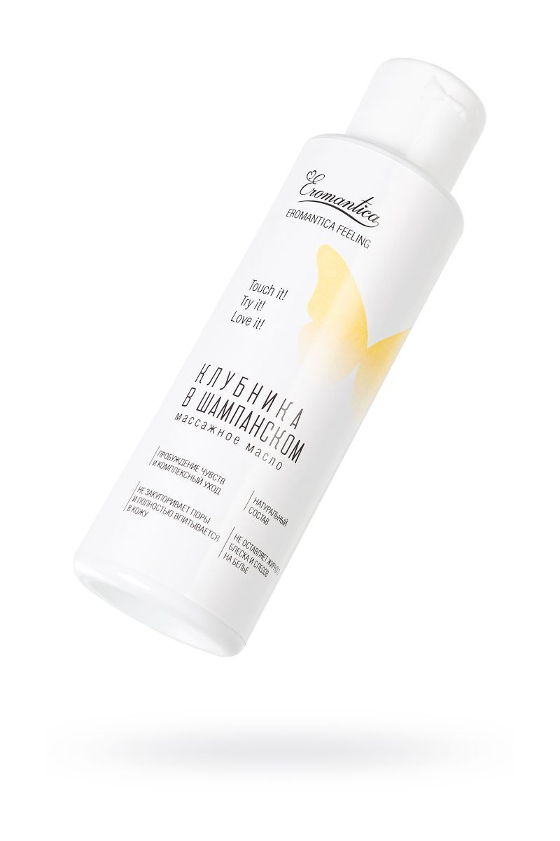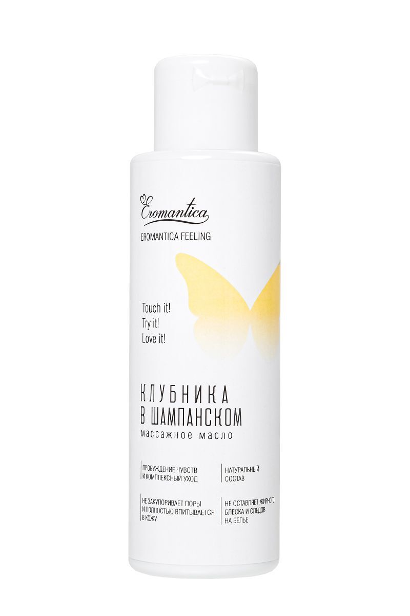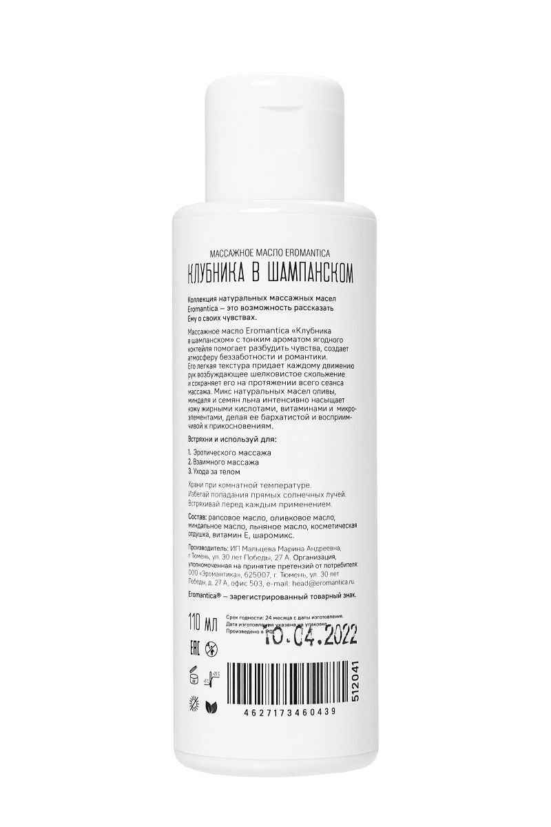 Коллекция натуральных массажных масел Eromantica — это возможность рассказать Ему о своих чувствах. Массажное масло Eromantica «Клубника в шампанском» с тонким ароматом ягодного коктейля помогает разбудить чувства и создает атмосферу беззаботности и романтики. Его легкая текстура придает каждому движению рук возбуждающее шелковистое скольжение и сохраняет его на протяжении всего сеанса массажа. Микс натуральных масел оливы, миндаля и семян льна интенсивно насыщает кожу жирными кислотами, витаминами и микроэлементами, делая ее бархатистой и восприимчивой к прикосновениям. Встряхни и используй для: Эротического массажа: согрей масло в ладонях и распредели его по телу партнера плавными массажными движениями. Особое внимание уделяй эрогенным зонам. Взаимного массажа: нанесите масло на тела друг друга и одновременно совершайте медленные массажные движения. Вы можете массировать грудь, бедра или руки друг друга. Ухода за телом: нанеси сразу после душа на влажную кожу и равномерно распредели по телу.